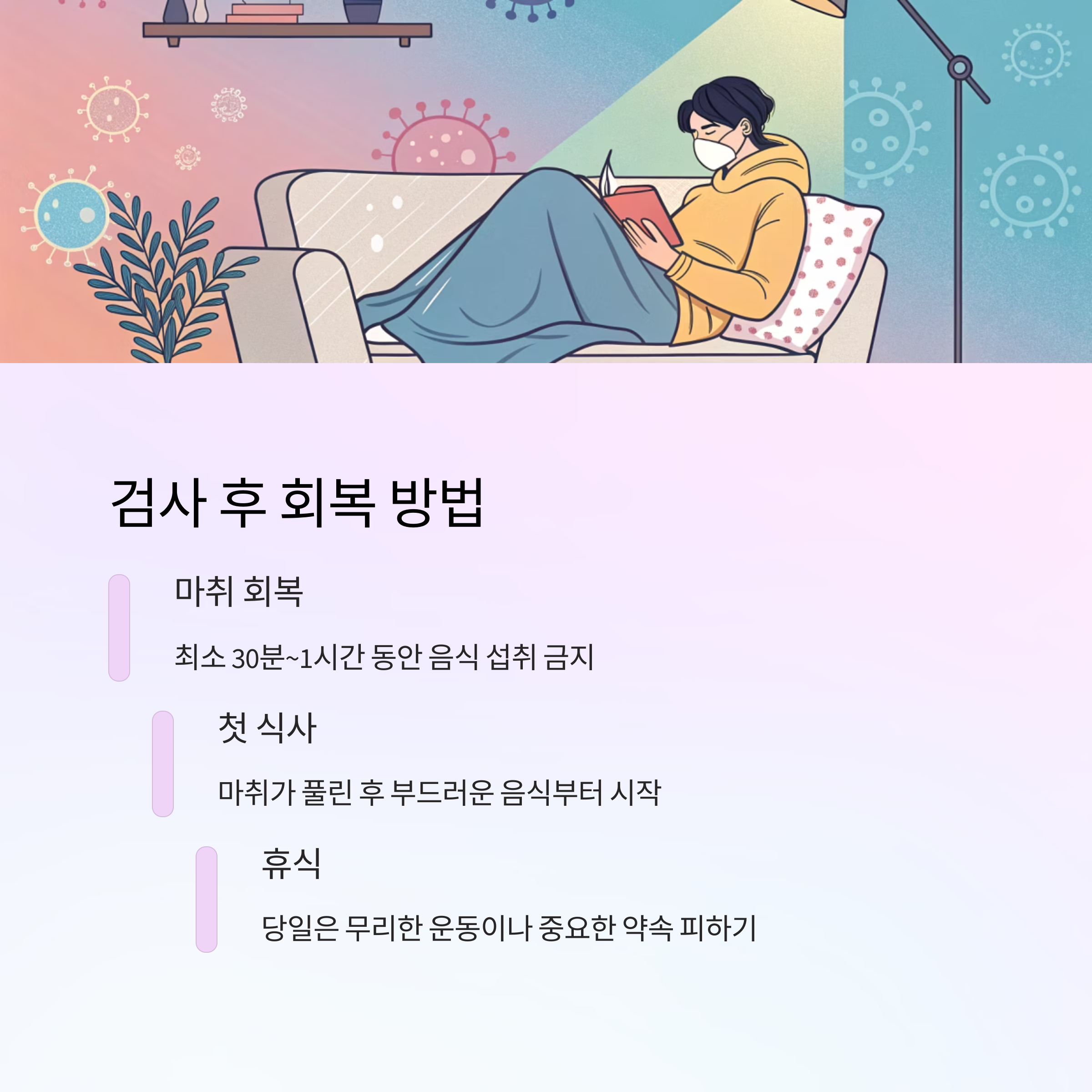 수면내시경은 편리하지만, 검사 후 하루는 중요한 결정을 미루고, 휴식을 취하는 것이 가장 좋아요. 몸이 완전히 회복될 때까지는 무리하지 않는 게 안전해요!