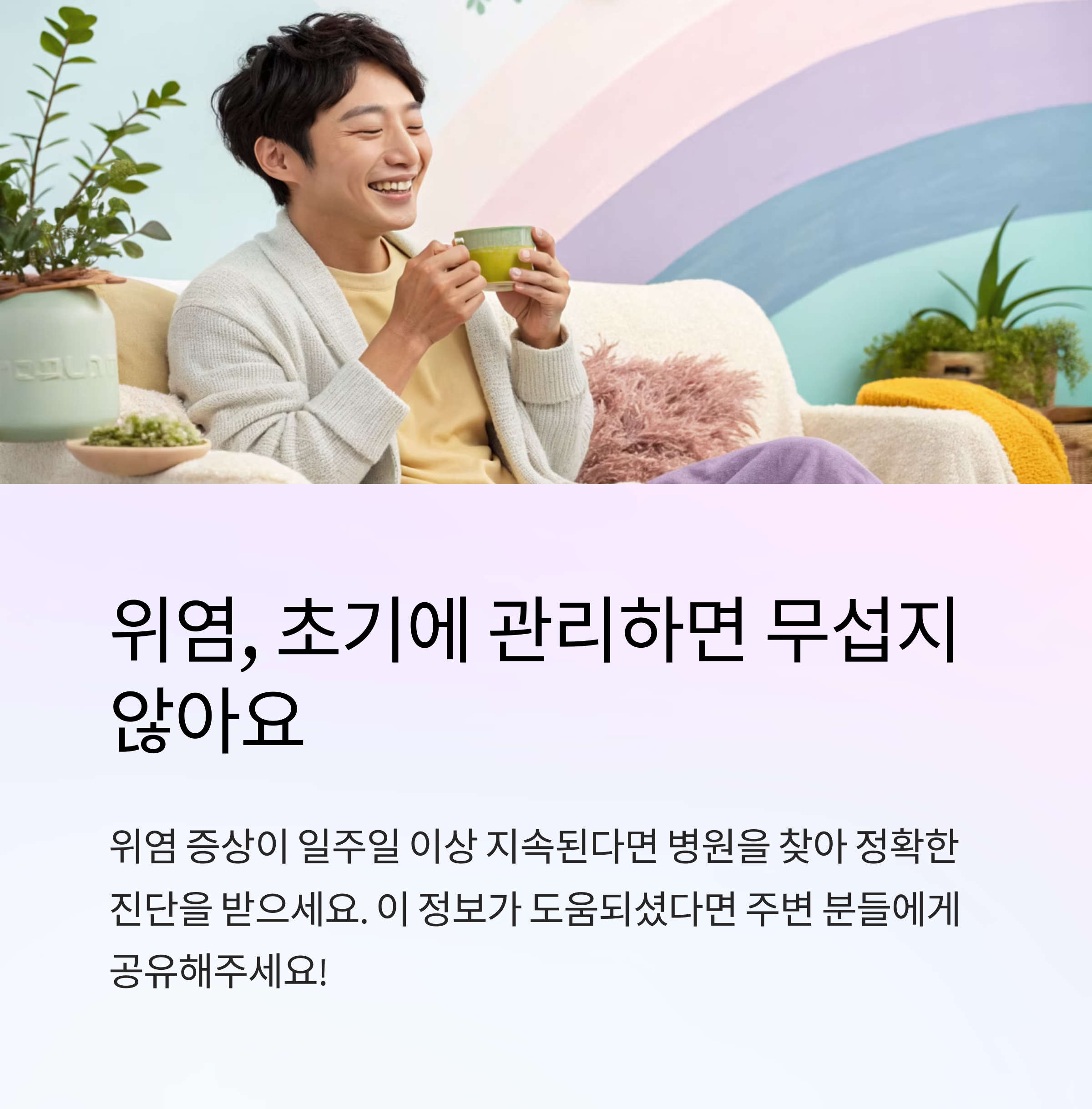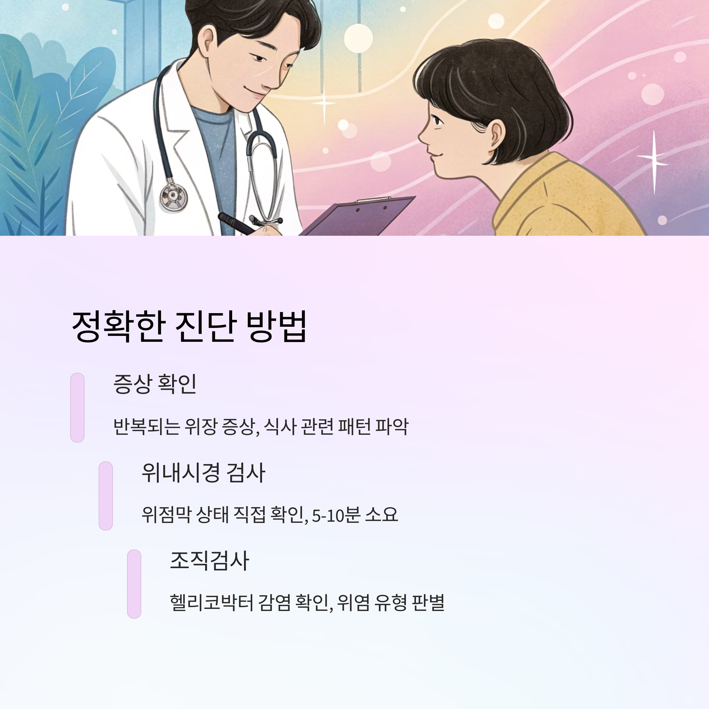 정확한 진단은 위염의 종류뿐 아니라 치료 방향을 정하는 데도 결정적인 역할을 해요. "혹시나…" 하는 마음이 들 때 바로 병원을 찾는 것이 현명한 선택이에요.
