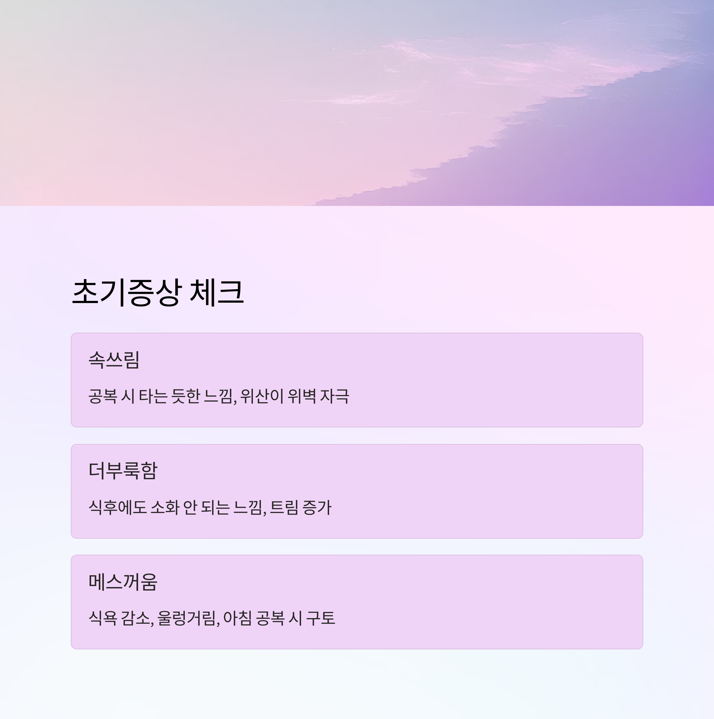 위염 초기에는 아주 미세한 신호들로 시작되기 때문에 많은 사람들이 이를 무시하고 지나치기 쉬워요. 가장 대표적인 초기 증상은 바로 속쓰림 이에요. 위산이 위벽을 자극하면서 타는 듯한 느낌을 주고, 특히 공복일 때 더 심해질 수 있어요.
