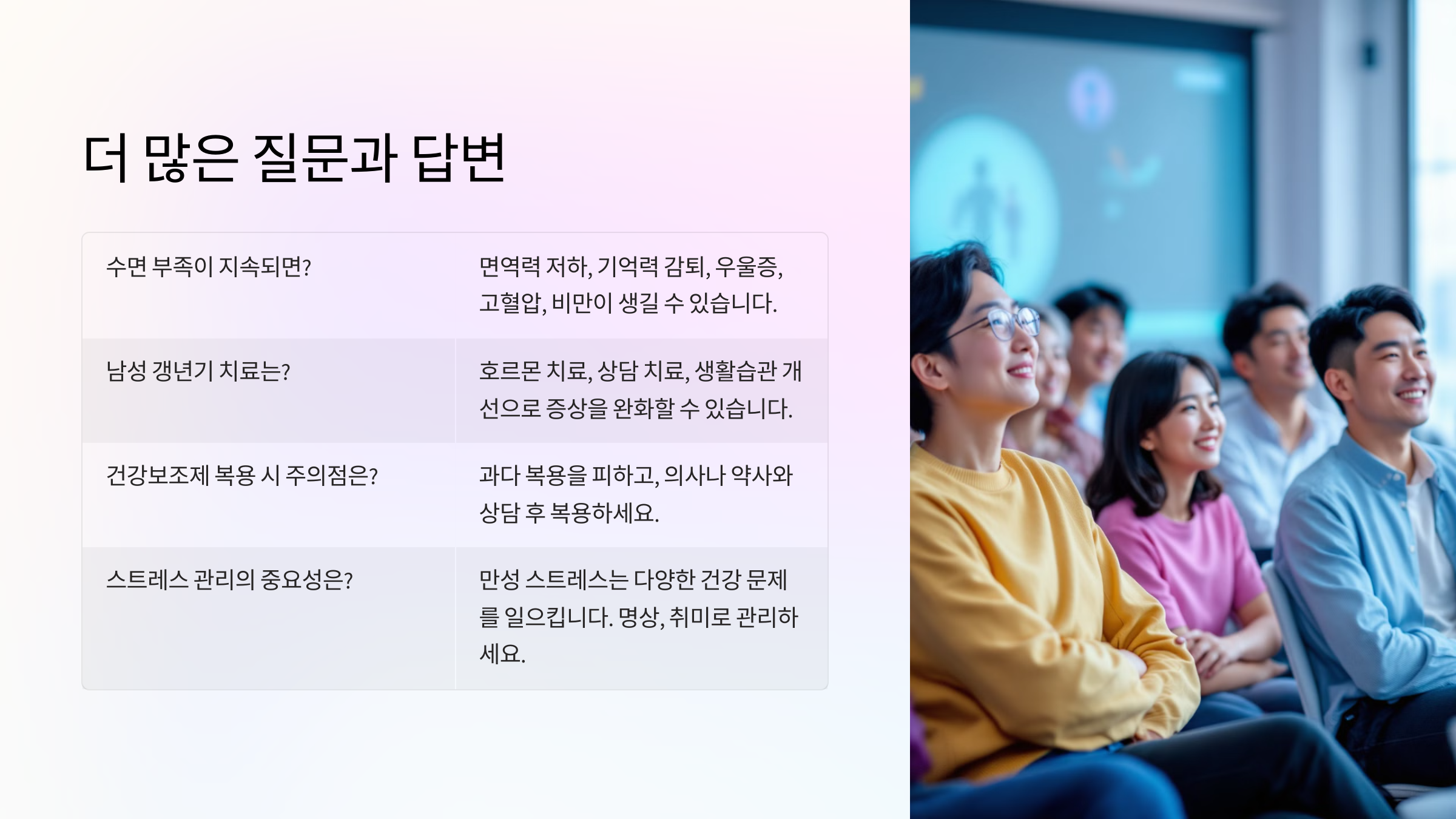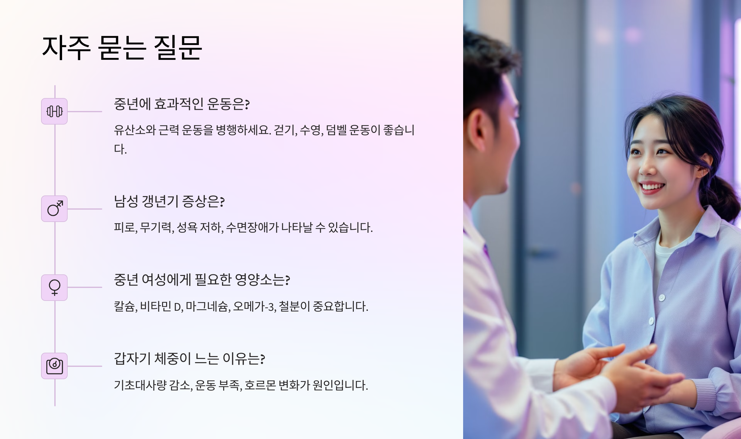 중년의 변화는 자연스러운 현상이에요. 몸이 보내는 신호를 무시하지 말고, 필요하다면 전문가와 상담해보는 것도 좋아요. 호르몬 검사나 심리 상담 등을 통해 건강 상태를 정확히 아는 게 중요해요.