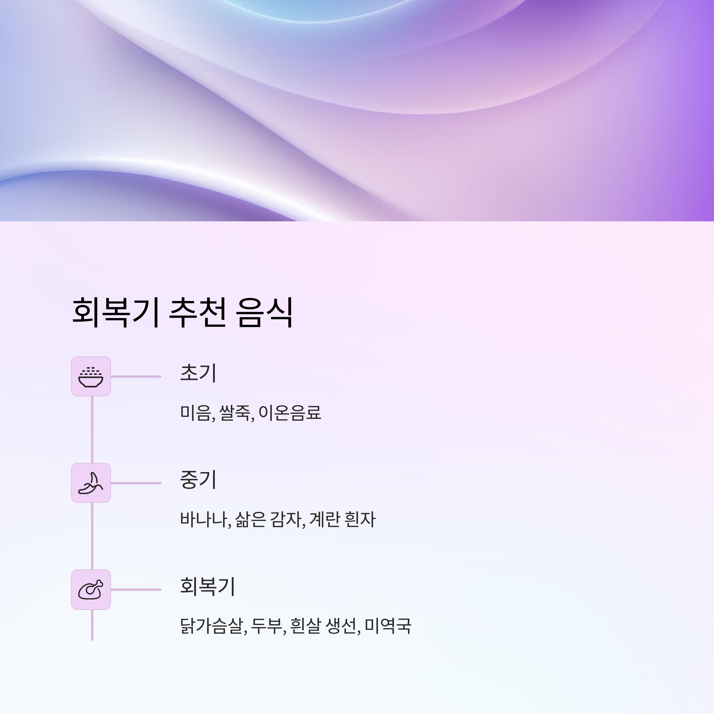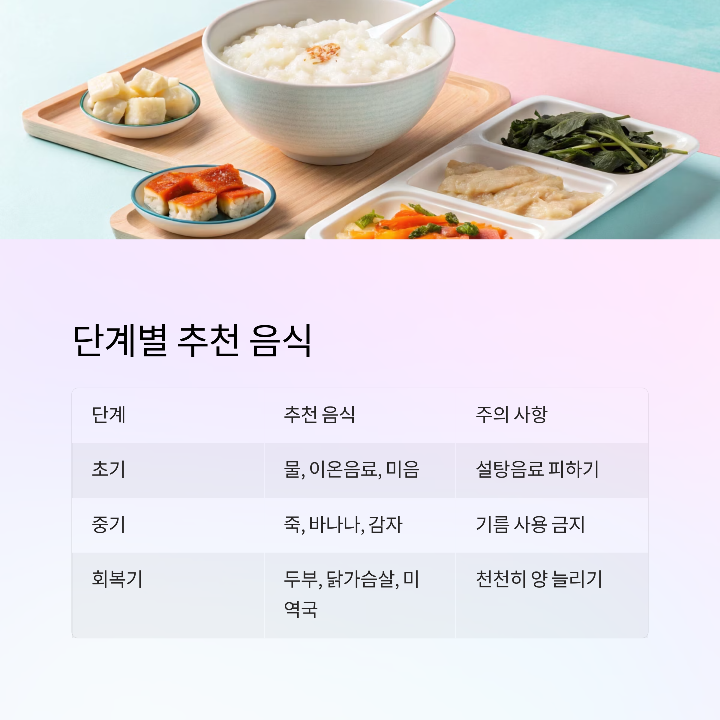 회복은 단계적으로 이뤄져요. 처음엔 아무것도 못 먹는 상태지만, 조금 나아지면 미음 → 죽 → 부드러운 밥 순으로 식단을 조절하면 좋아요. 갑자기 기름진 음식이나 밀가루, 유제품을 먹으면 증상이 재발할 수 있으니 주의해야 해요.