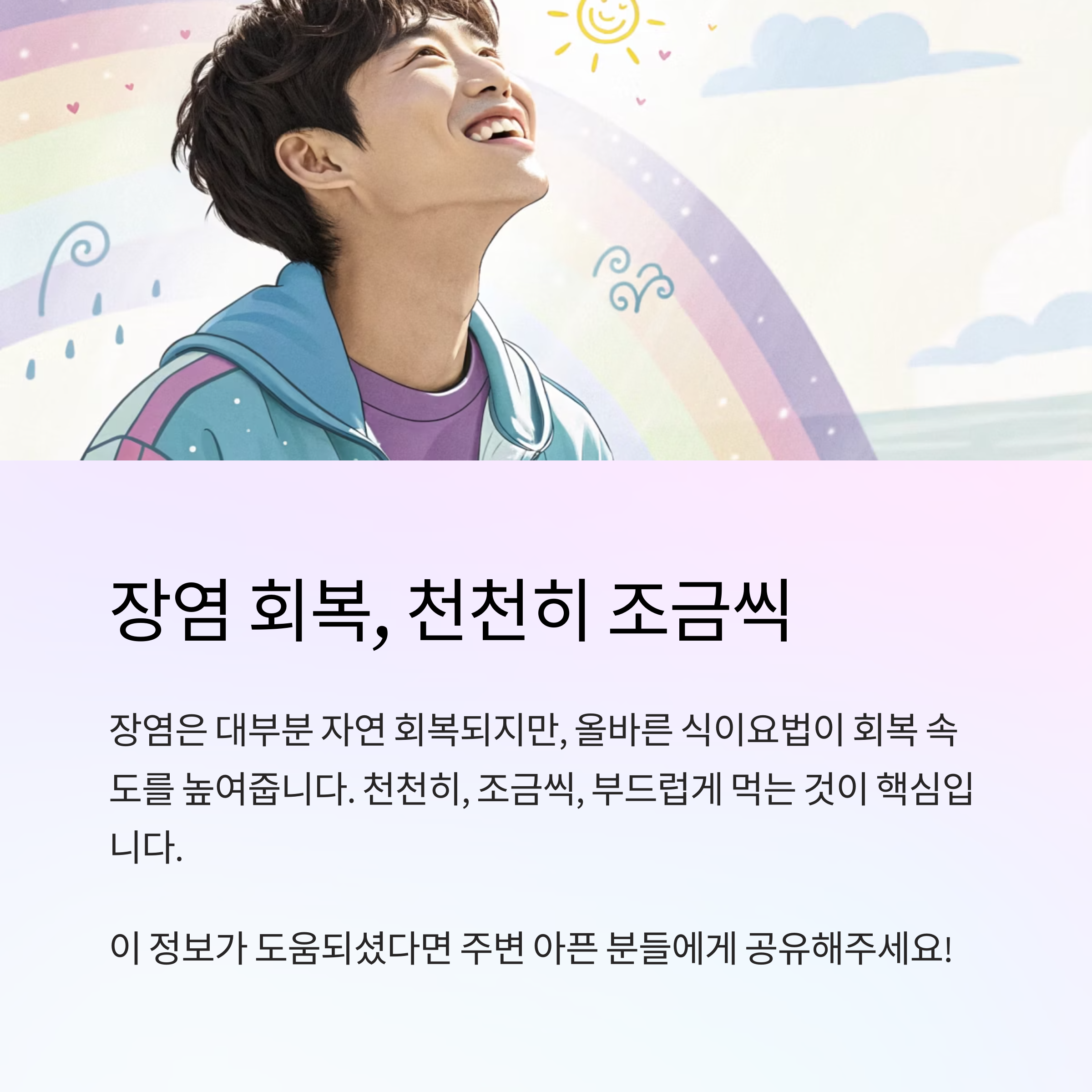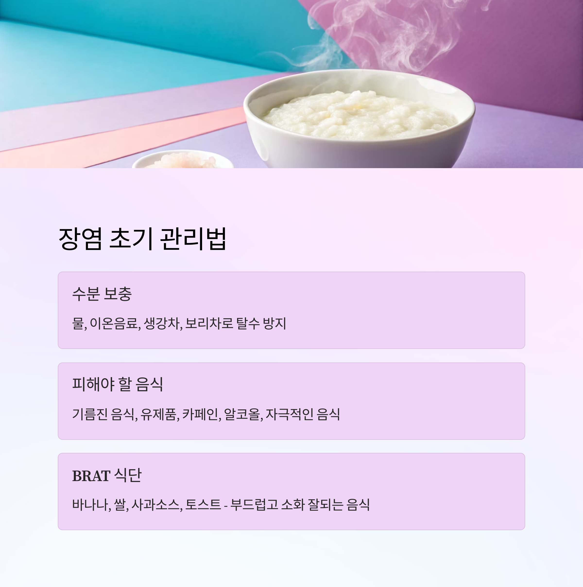 그리고 장염이 회복된 후에도 며칠 간은 자극적인 음식, 유제품, 알코올 등을 피해야 해요. 장은 회복되는데 시간이 걸리니까 급하게 평소 식단으로 돌아가지 말고, 몸 상태를 잘 관찰하며 천천히 식단을 늘리는 것이 핵심이에요. 💡
