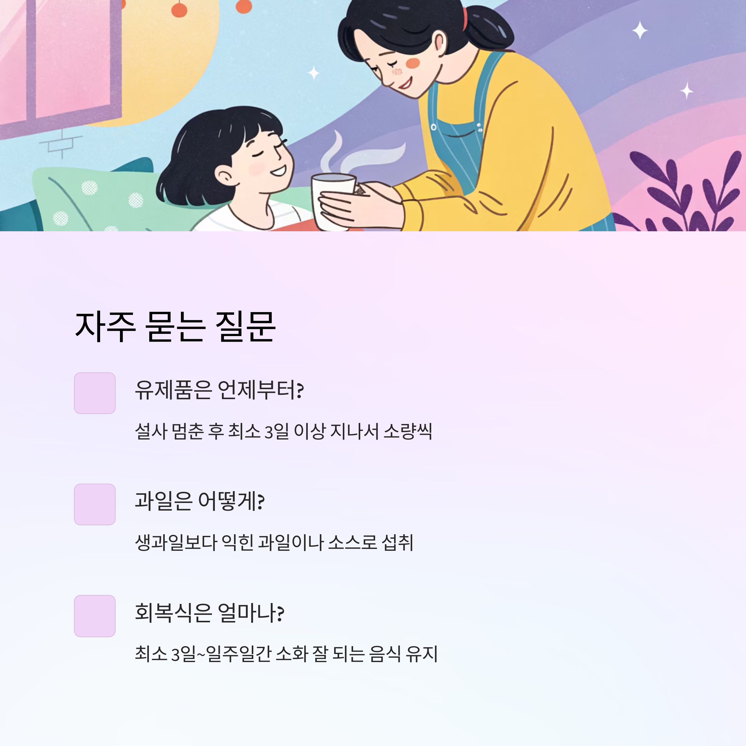 A1. 설사가 멈춘 후 최소 3일 이상 지나고, 장이 안정됐다고 느낄 때 소량씩 시도해보는 게 좋아요.