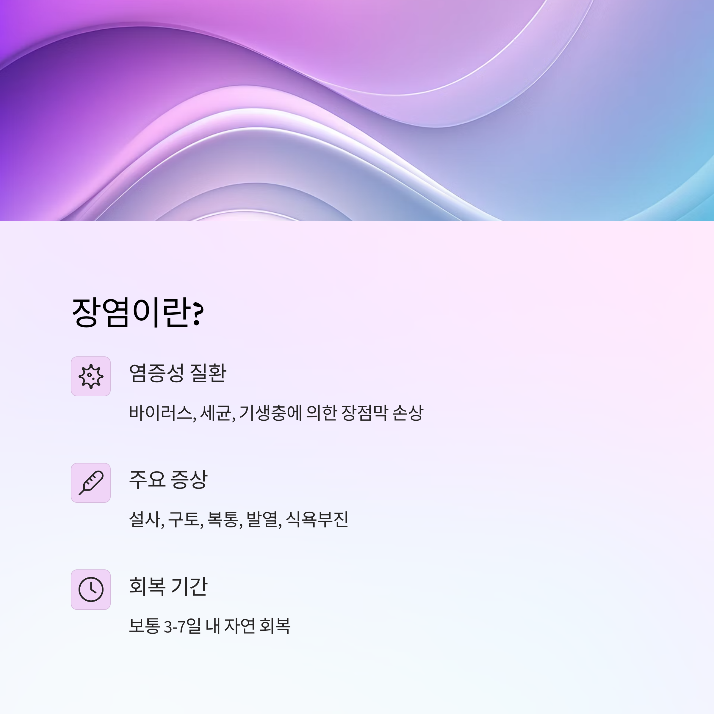장염은 말 그대로 장에 염증이 생기는 질환이에요. 바이러스, 세균, 기생충 등 다양한 원인으로 장점막이 손상되면서 염증이 생기고 설사, 구토, 복통 같은 증상이 나타나게 되죠. 가장 흔한 원인은 노로바이러스나 로타바이러스와 같은 감염성 바이러스예요.