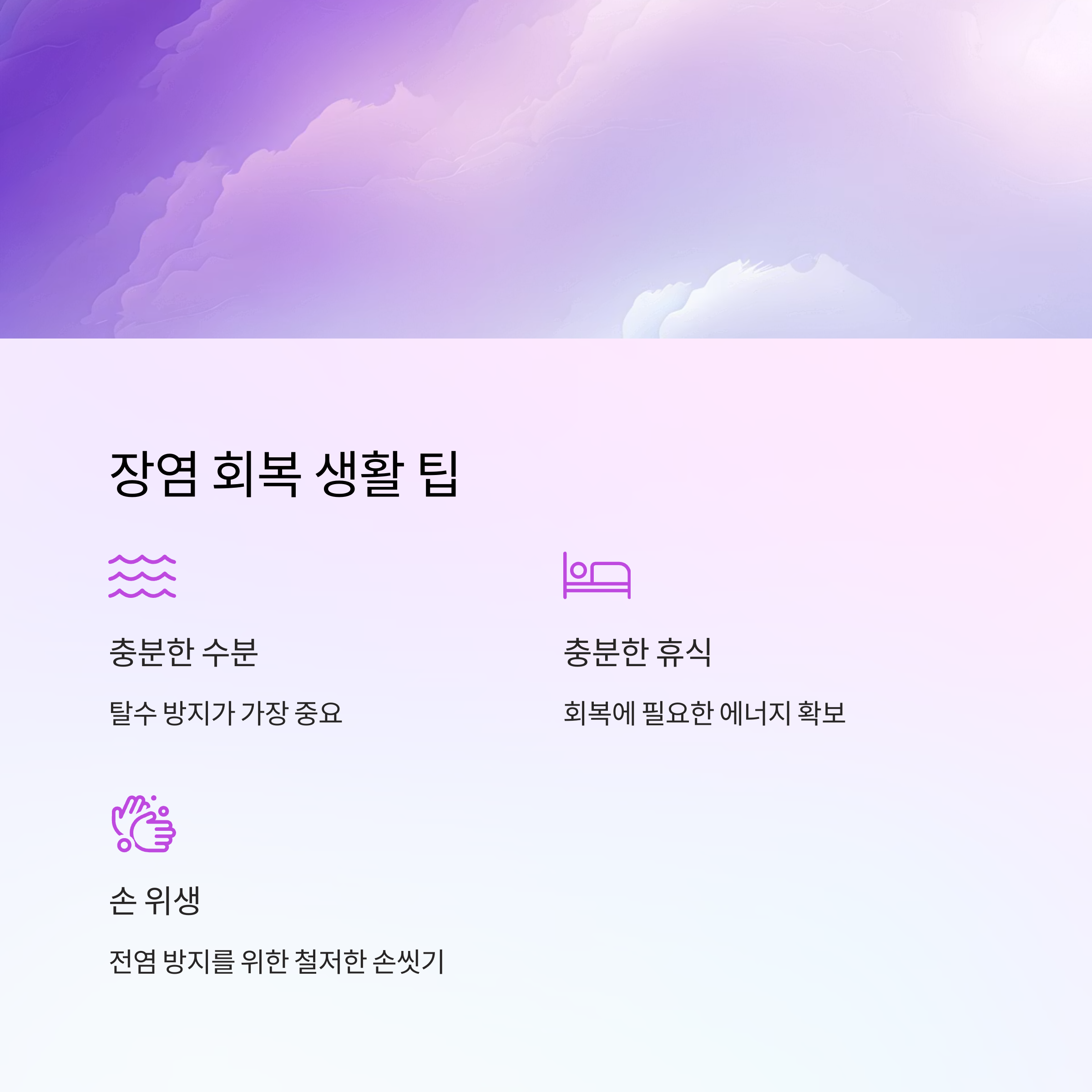 세 번째는 손 위생이에요. 장염은 대부분 전염성이 있기 때문에 손을 자주, 제대로 씻는 것이 중요해요. 화장실 이용 후, 외출 후, 음식 전후 등 손 씻기를 생활화하면 가족 간 전파도 막을 수 있어요.