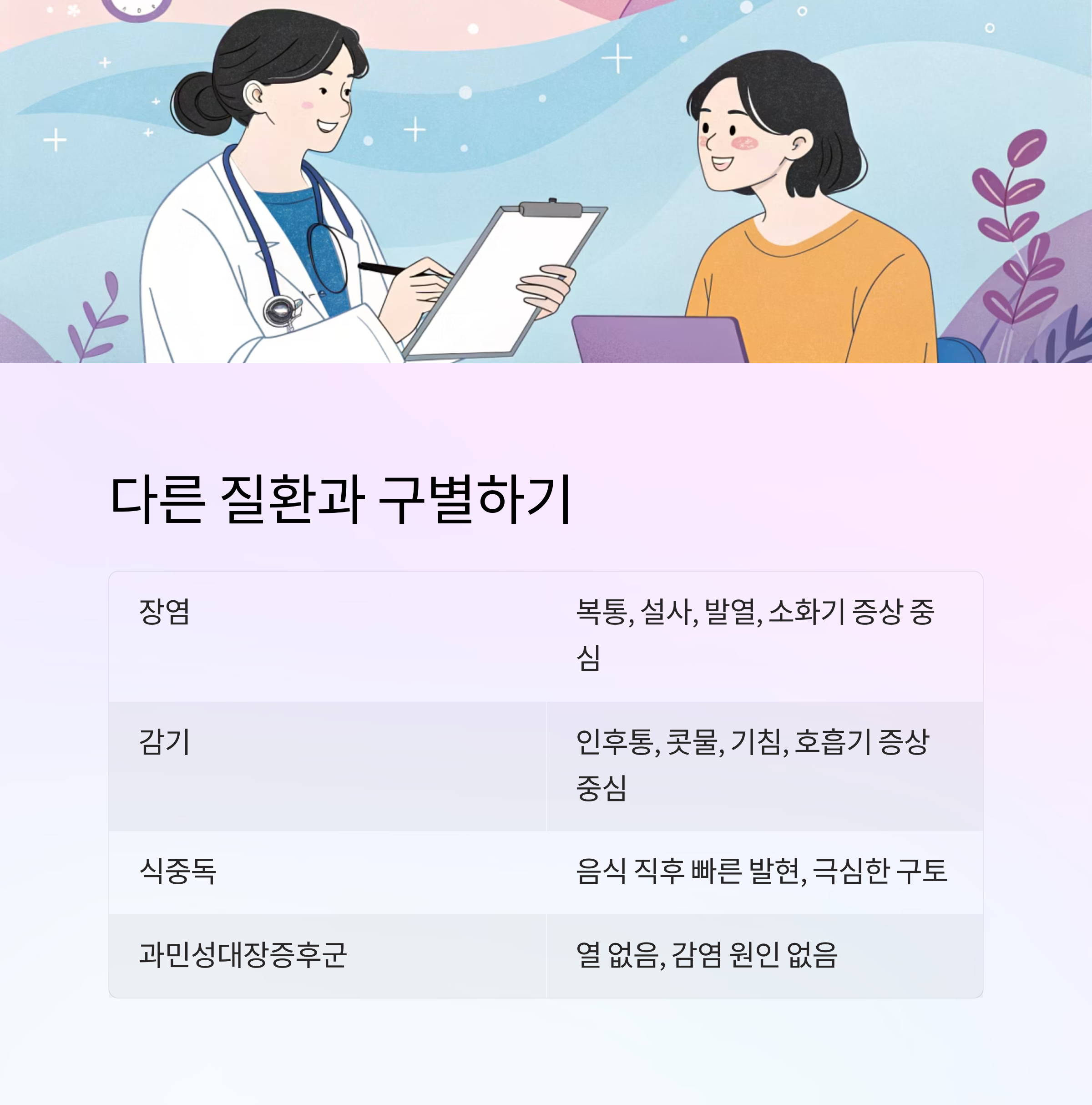장염 초기증상이 흔한 증상들과 겹치기 때문에, 다른 질환과 혼동하기 쉬운 것도 사실이에요. 특히 감기, 식중독, 과민성대장증후군, 위염 등과 비슷한 증상들이 겹칠 수 있어요. 그래서 증상의 차이점을 정확히 이해하고 구별하는 게 정말 중요해요.