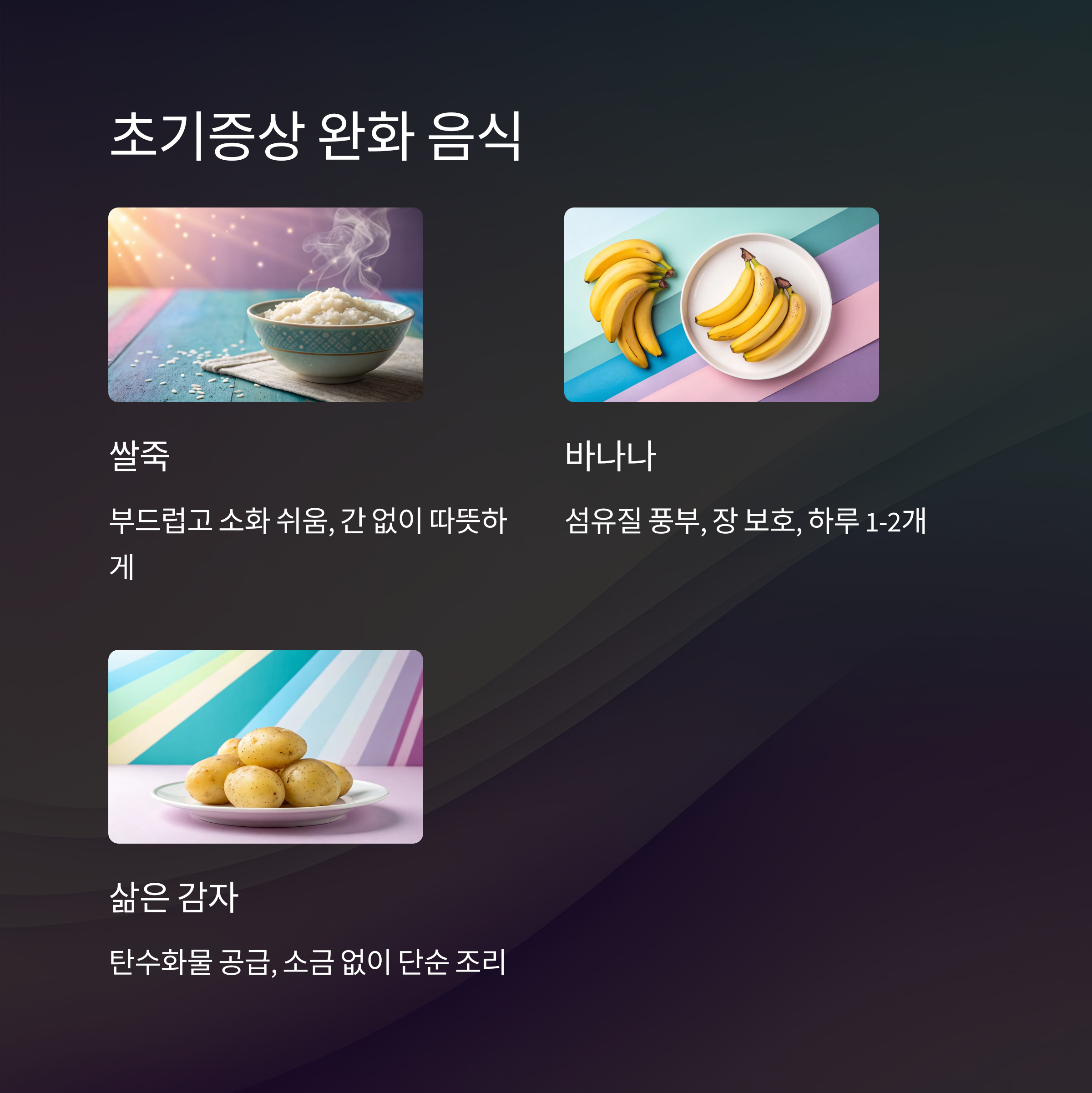 A2. 초기에는 식사를 쉬는 것도 좋아요. 하지만 수분은 꼭 섭취해야 하며, 증상이 조금 나아지면 부드러운 음식부터 천천히 먹는 것이 회복에 도움이 돼요.