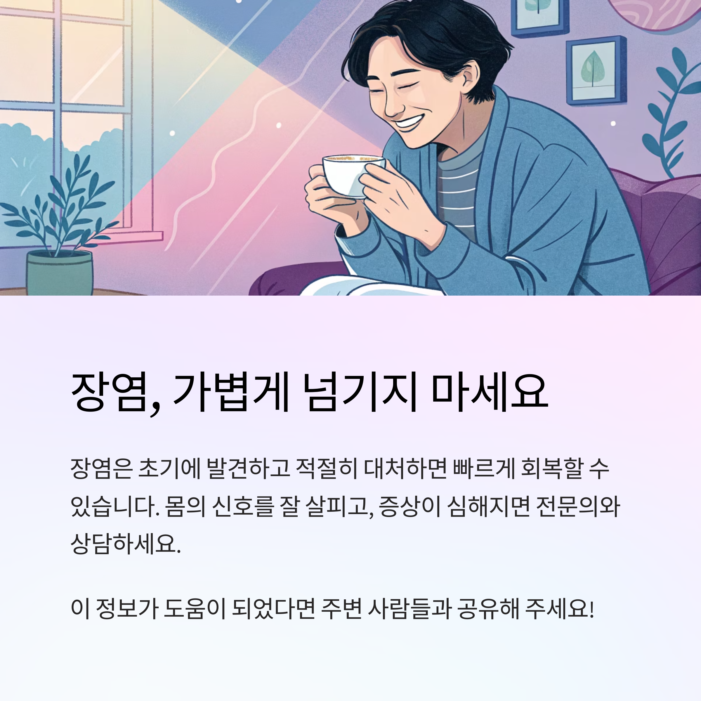 장염은 대부분 며칠 안에 회복되지만, 드물게는 중증으로 악화되어 탈수나 장기 손상까지 이를 수 있으므로 가볍게 넘기면 안 돼요.