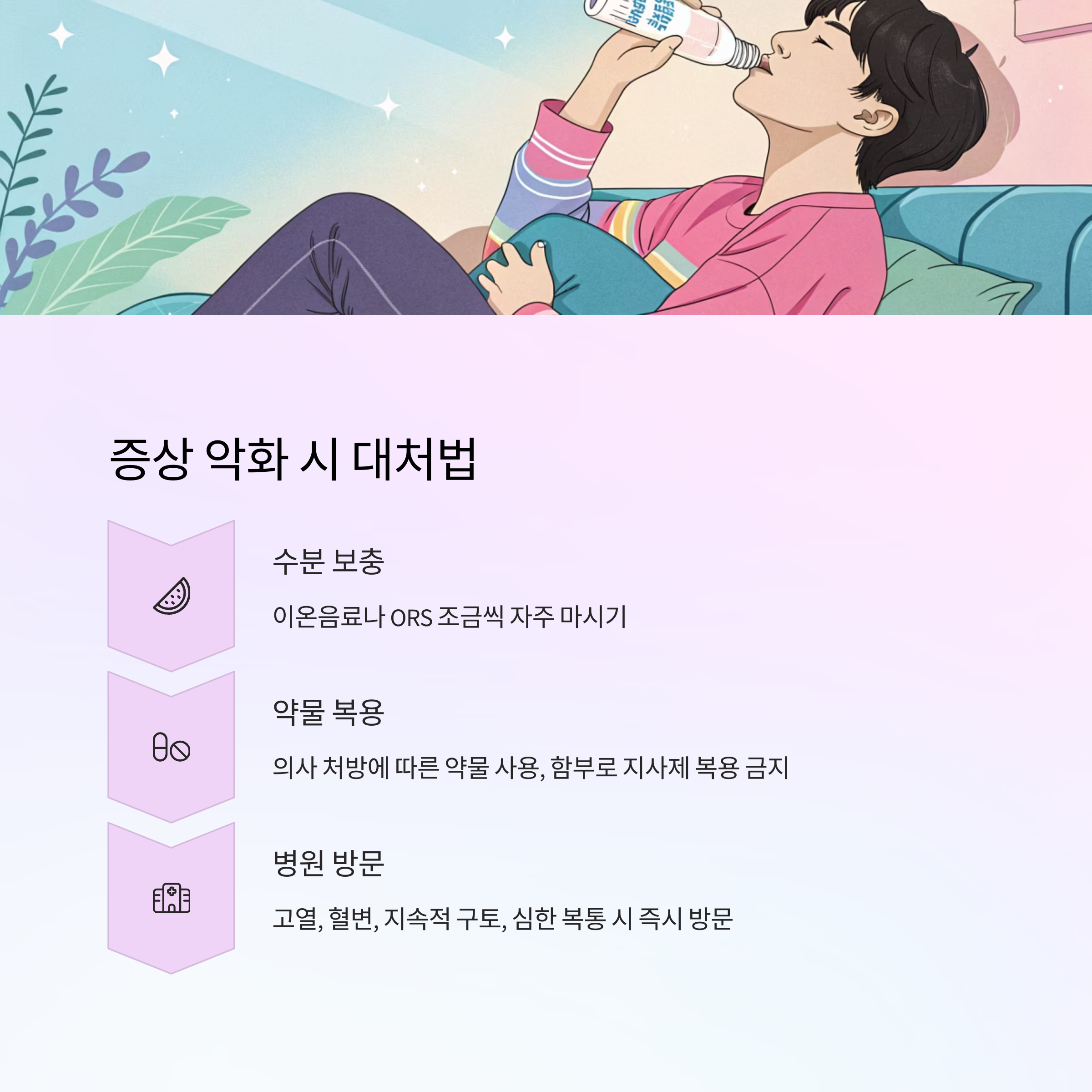 지금까지 말한 내용에 하나라도 해당된다면, 몸을 쉬게 하고 수분을 충분히 섭취하는 것이 우선이에요. 무리하게 활동하거나 음식을 억지로 먹는 건 장을 더 힘들게 할 수 있으니 주의가 필요해요 🧼