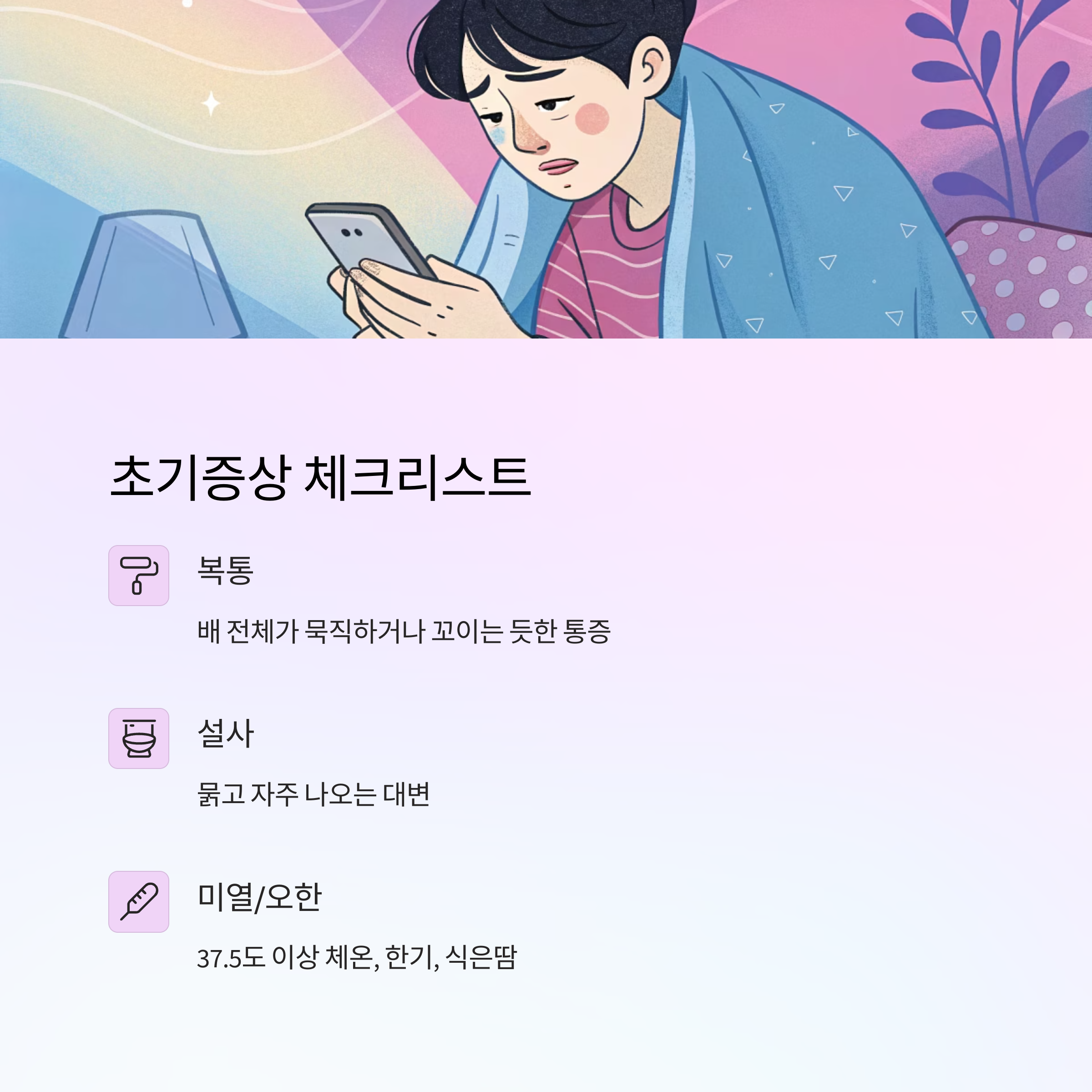 이렇게 다양한 원인에 따라 장염이 생기기 때문에 단순히 한 가지 증상만 보고 판단하기보다는, 전체적인 상황과 동반 증상을 종합적으로 파악하는 게 중요해요. 다음 문단에서는 초기증상을 본격적으로 살펴볼게요 🔍