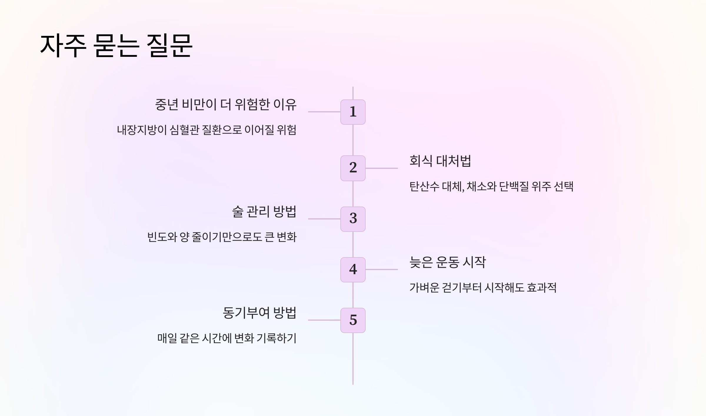 ‘중년 비만’은 단순한 게으름 때문이 아니에요. 사회적 책임, 회사생활, 스트레스, 가정 내 역할까지 겹치면서 건강을 돌볼 여유조차 없는 경우가 많아요. 하지만 내가 생각했을 때, 가장 큰 문제는 건강을 우선순위에서 점점 뒤로 미룬다는 점이에요. 이제부터라도 조금씩 습관을 바꾼다면, 더 늦기 전에 삶의 질을 회복할 수 있어요.
