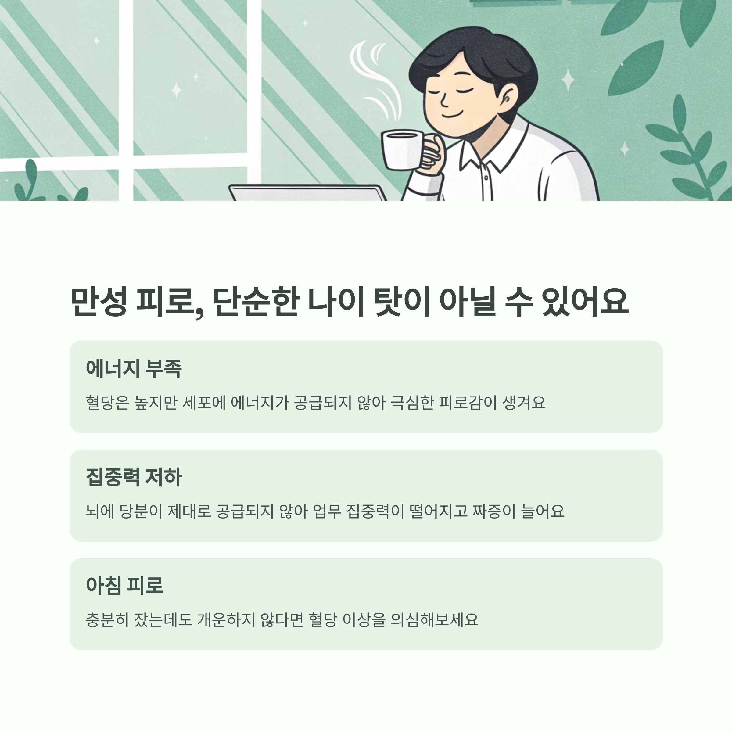 아침에 눈을 떠도 개운하지 않고, 하루 종일 기운이 없고, 아무것도 하기 싫은 날들이 반복된다면 단순히 스트레스나 나이 탓이 아닐 수 있어요. 중년의 만성 피로감은 당뇨 초기의 대표적인 신호 중 하나예요. 우리 몸은 혈당을 에너지로 사용하는데, 이 에너지가 제대로 공급되지 않으면 만성 피로를 느끼게 돼요.