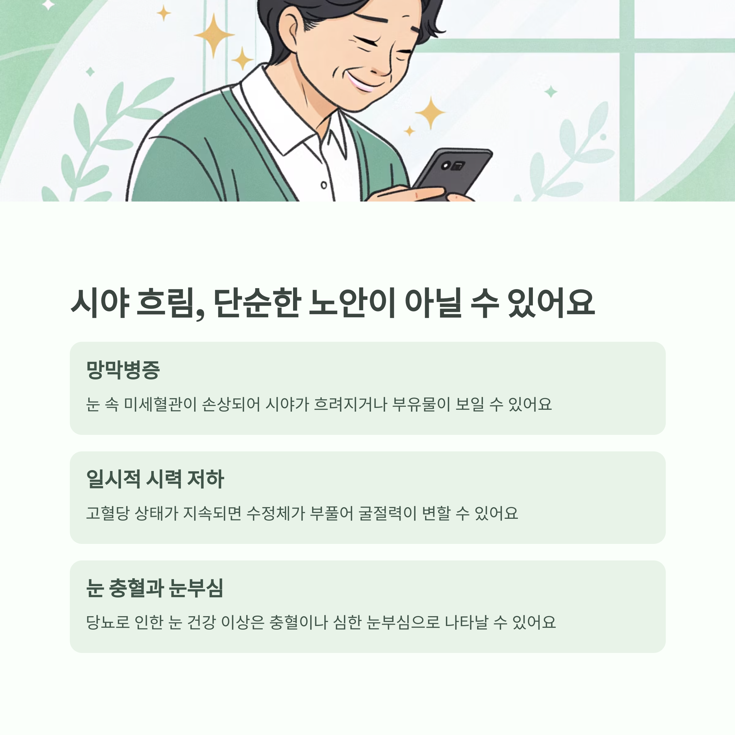 눈 건강은 한번 손상되면 회복이 어렵기 때문에, 시력에 작은 변화가 있더라도 방치하지 말고 혈당 검사를 함께 해보는 게 좋아요. 시력 저하는 때로는 가장 빠른 당뇨 경고일 수 있어요.