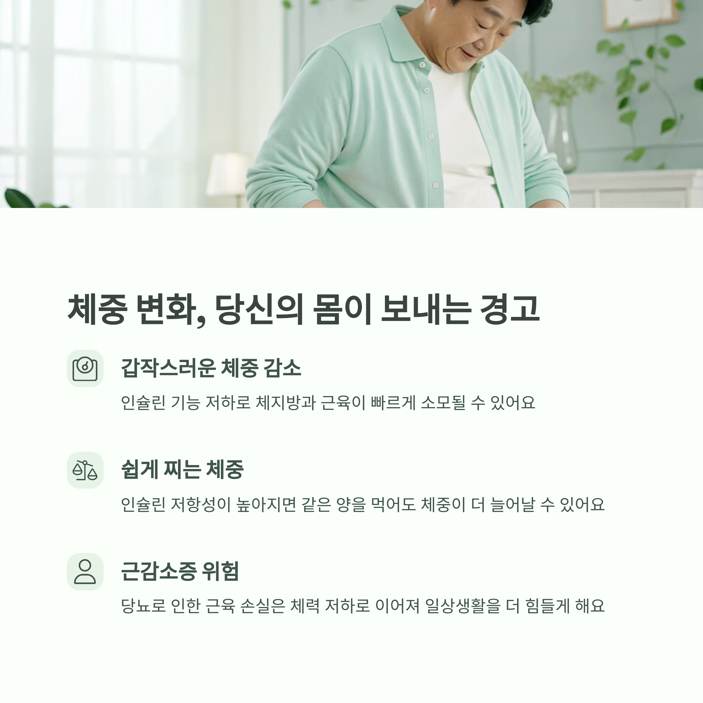 중년 이후 갑자기 살이 빠지거나, 별다른 이유 없이 체중이 증가했다면 단순한 노화 현상만은 아닐 수 있어요. 특히 최근 몇 달 사이 급격한 체중 변화가 있었다면 반드시 혈당 수치를 확인해봐야 해요. 당뇨는 체내 에너지원이 부족해지면서 체지방과 근육을 빠르게 소모하게 만들거든요.