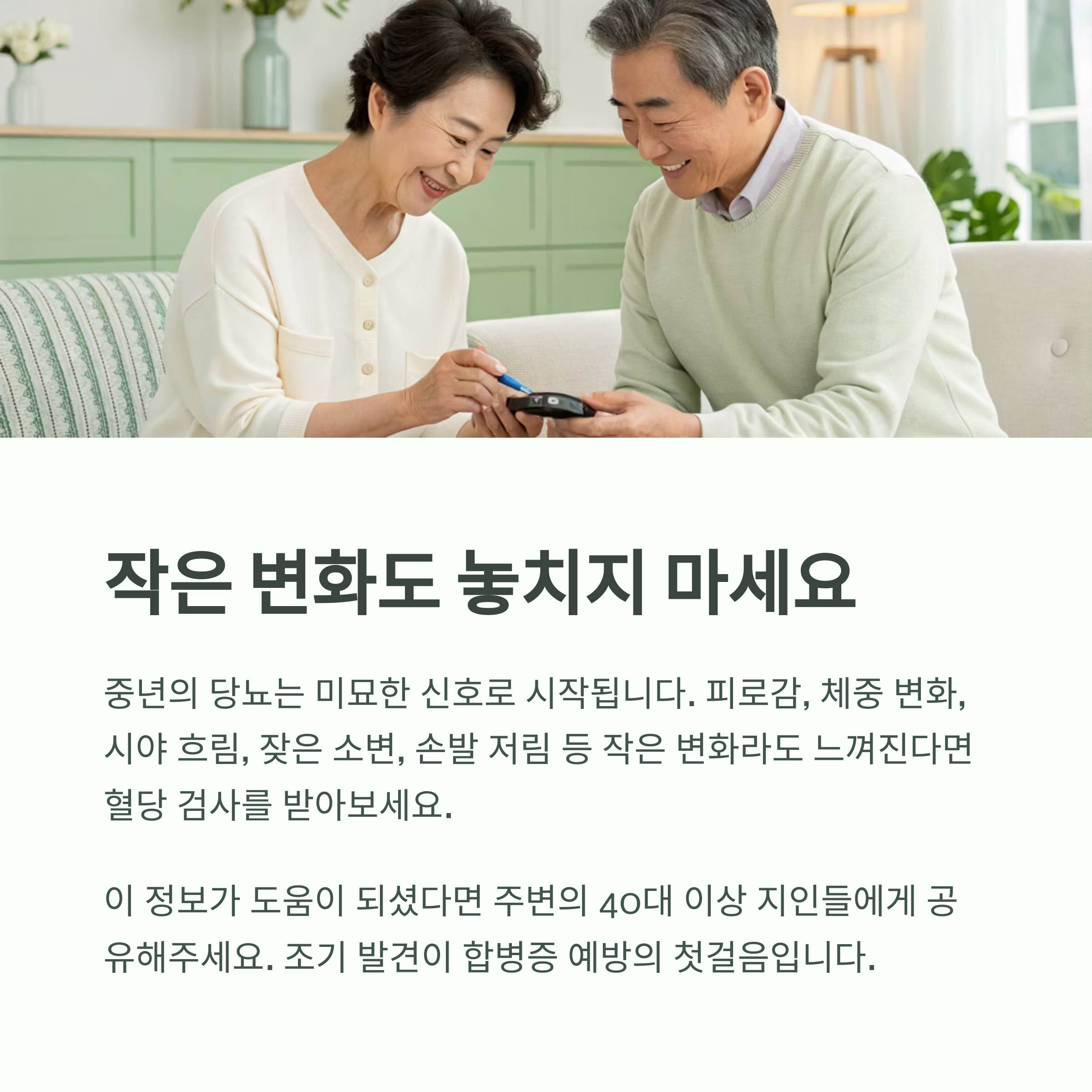 이 시기에는 건강검진만으로는 당뇨의 진행을 완전히 파악하기 어렵기 때문에, 일상적인 몸의 변화에 예민해지는 게 중요해요. “자꾸 눈이 침침해졌어” 또는 “밤에 화장실을 너무 자주 가” 같은 작은 신호들이 바로 몸이 보내는 메시지일 수 있어요.