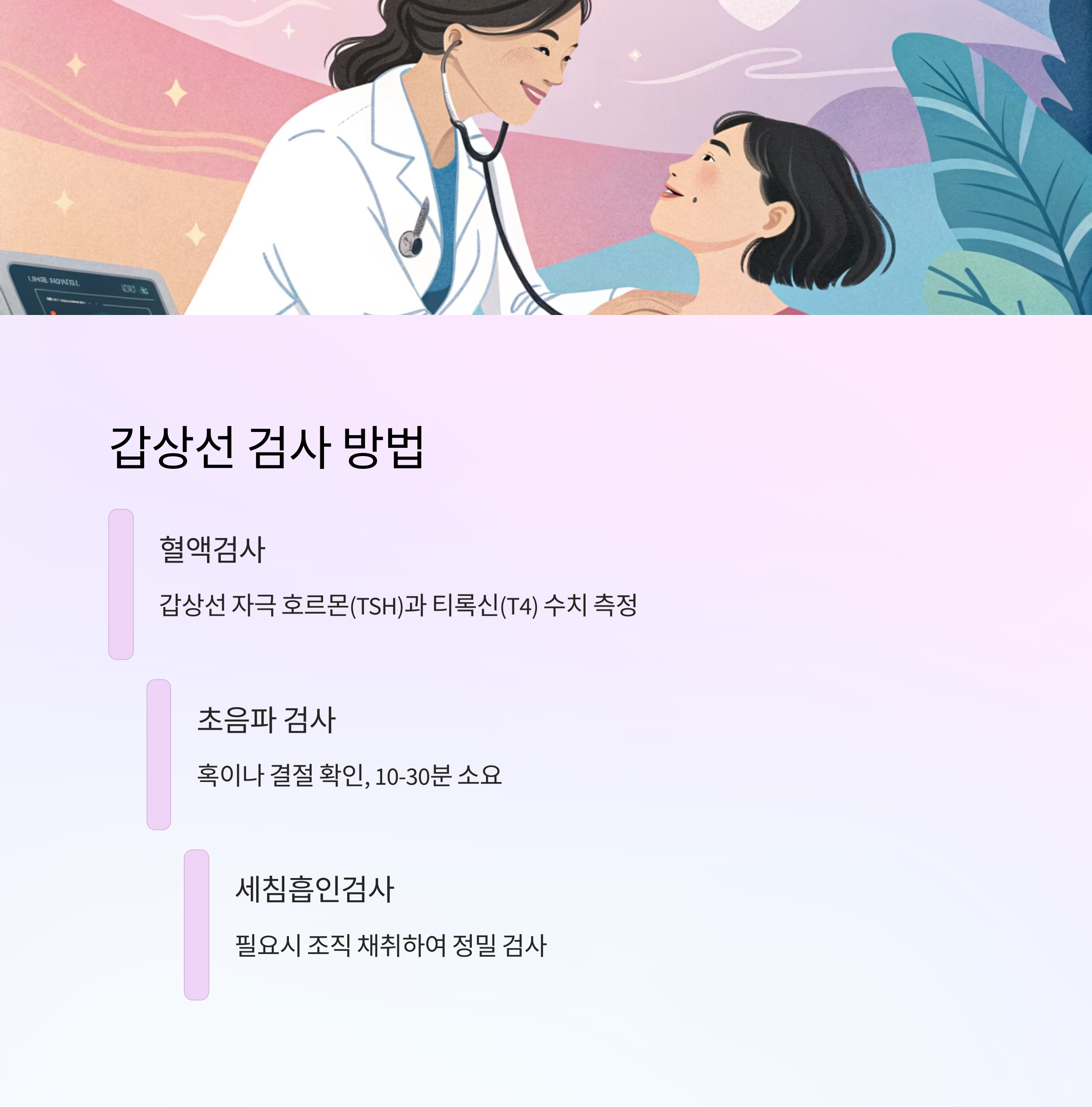갑상선 질환은 초기에 증상이 거의 없기 때문에 정기적인 검진이 정말 중요해요. 특히 중년 여성은 건강검진에서 갑상선 항목이 빠져 있는 경우가 많기 때문에, 별도로 요청해서 받는 것이 필요해요.