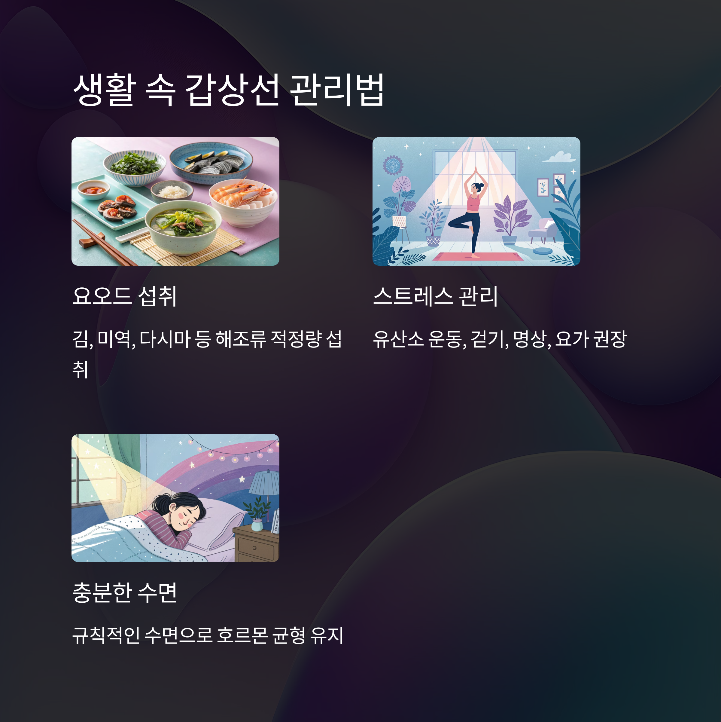 갑상선 건강을 유지하려면 평소 식습관과 생활 습관도 매우 중요해요. 요오드가 갑상선 호르몬 생성에 관여하므로 적정량을 섭취해야 해요. 김, 미역, 다시마 같은 해조류가 좋은 요오드 공급원이에요.