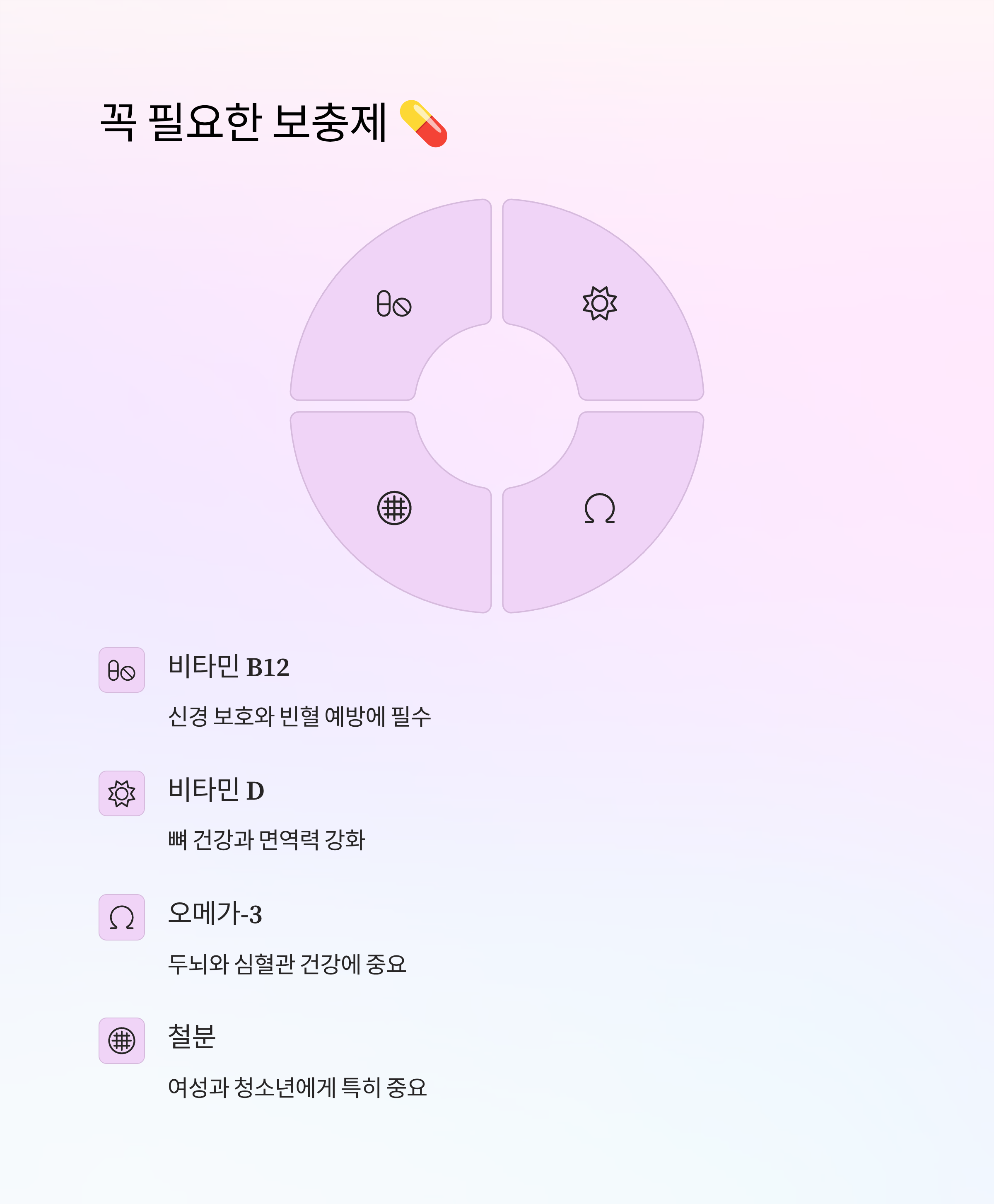 채식 식단이 아무리 잘 구성되어 있어도, 몇몇 영양소는 식물성 식품만으로 충분히 채우기 어려운 경우가 있어요. 특히 비타민 B12, 비타민 D, 철분, 오메가-3는 주의해서 따로 섭취해야 할 가능성이 크답니다.