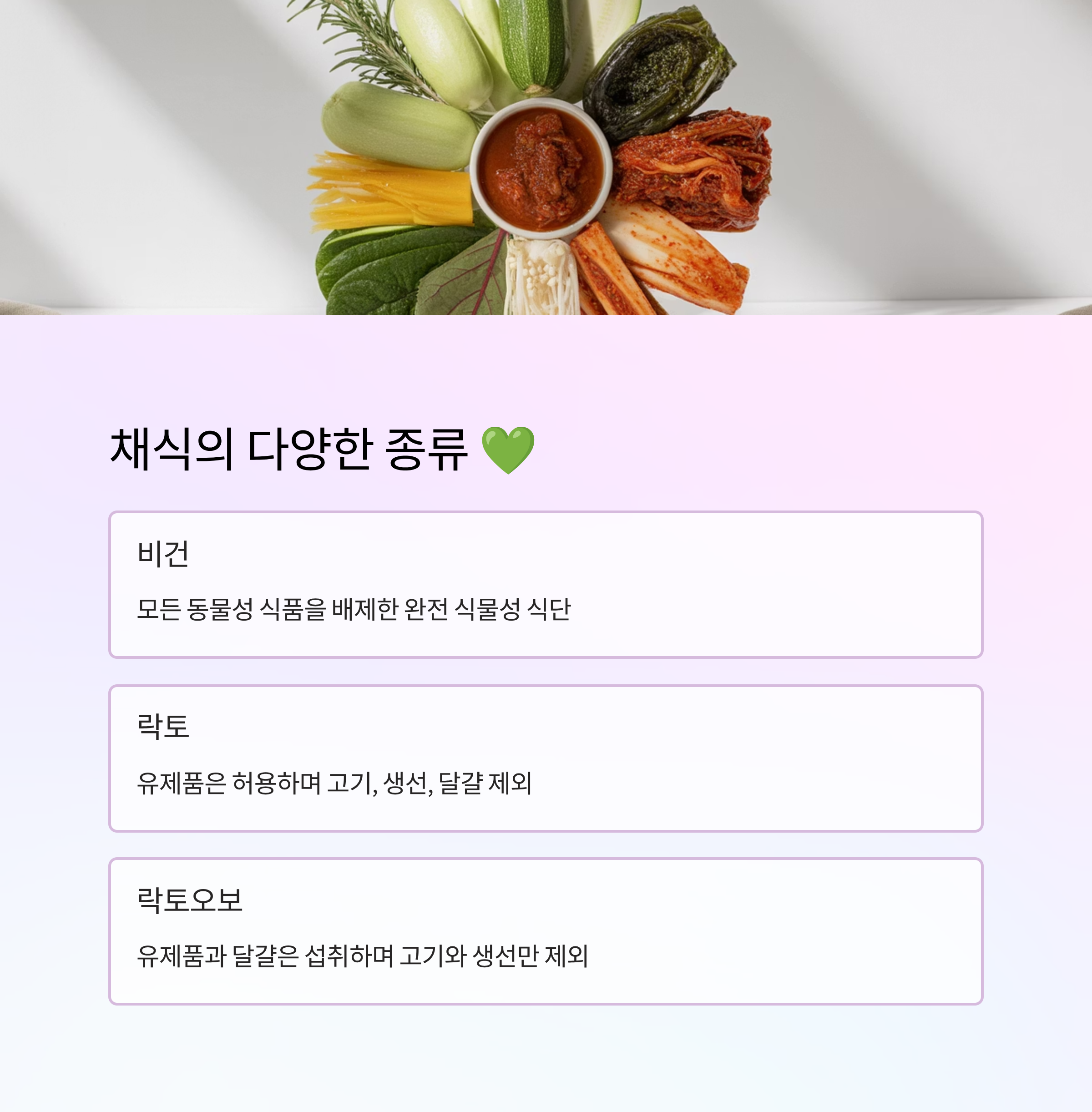 | 오보 채식 | 달걀 포함 | 고기, 생선, 유제품 | 알레르기 대응에 유리 |