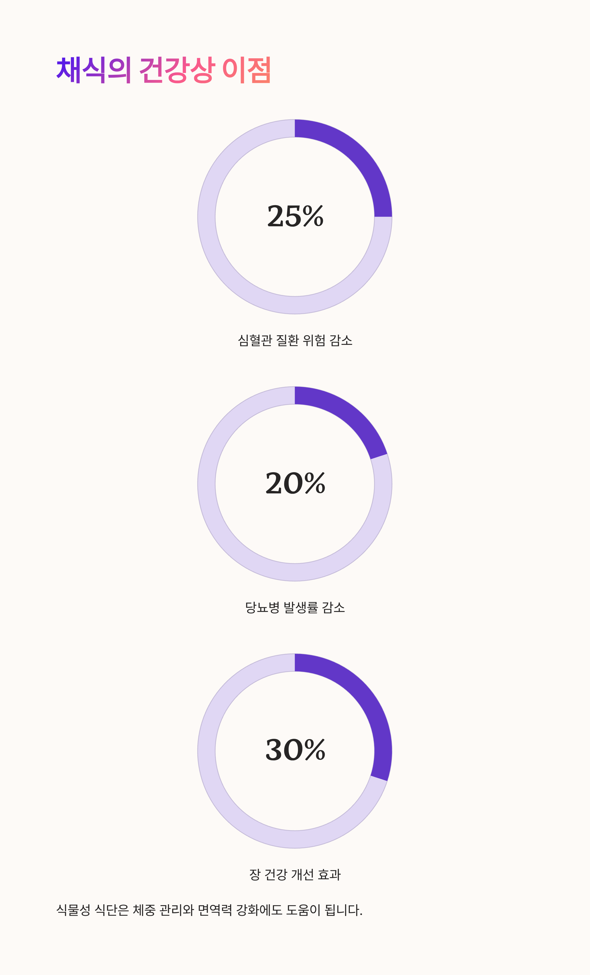 채식을 실천하는 사람들이 건강에 있어서 여러 가지 긍정적인 변화를 경험하는 경우가 많아요. 다양한 연구 결과들도 이를 뒷받침하고 있는데요, 특히 심혈관 건강, 체중 조절, 당뇨 예방, 장 건강 등에 유익한 영향을 준답니다.