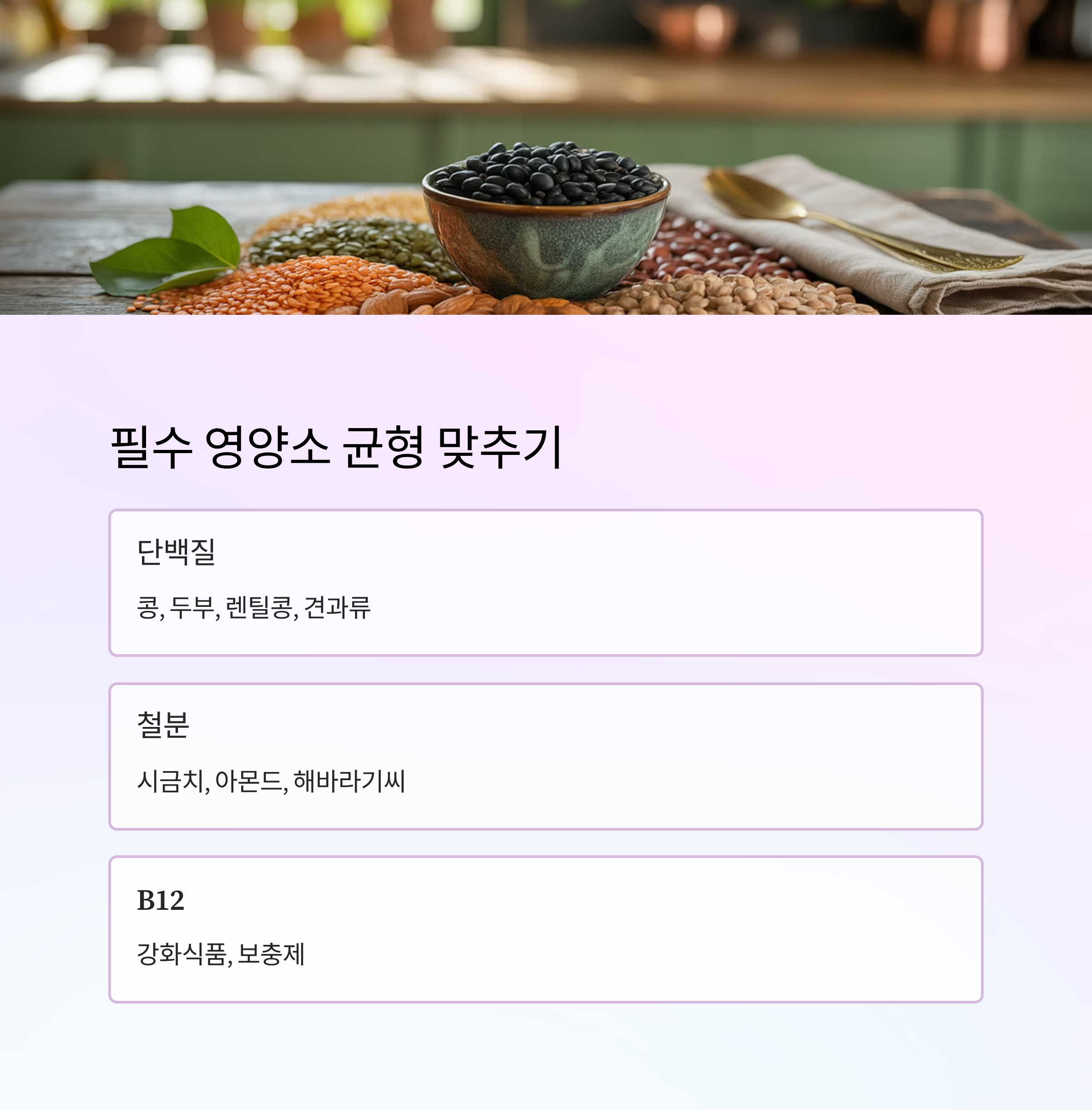 | 단백질 | 콩, 두부, 렌틸콩, 견과류 | 곡류와 함께 섭취 |
