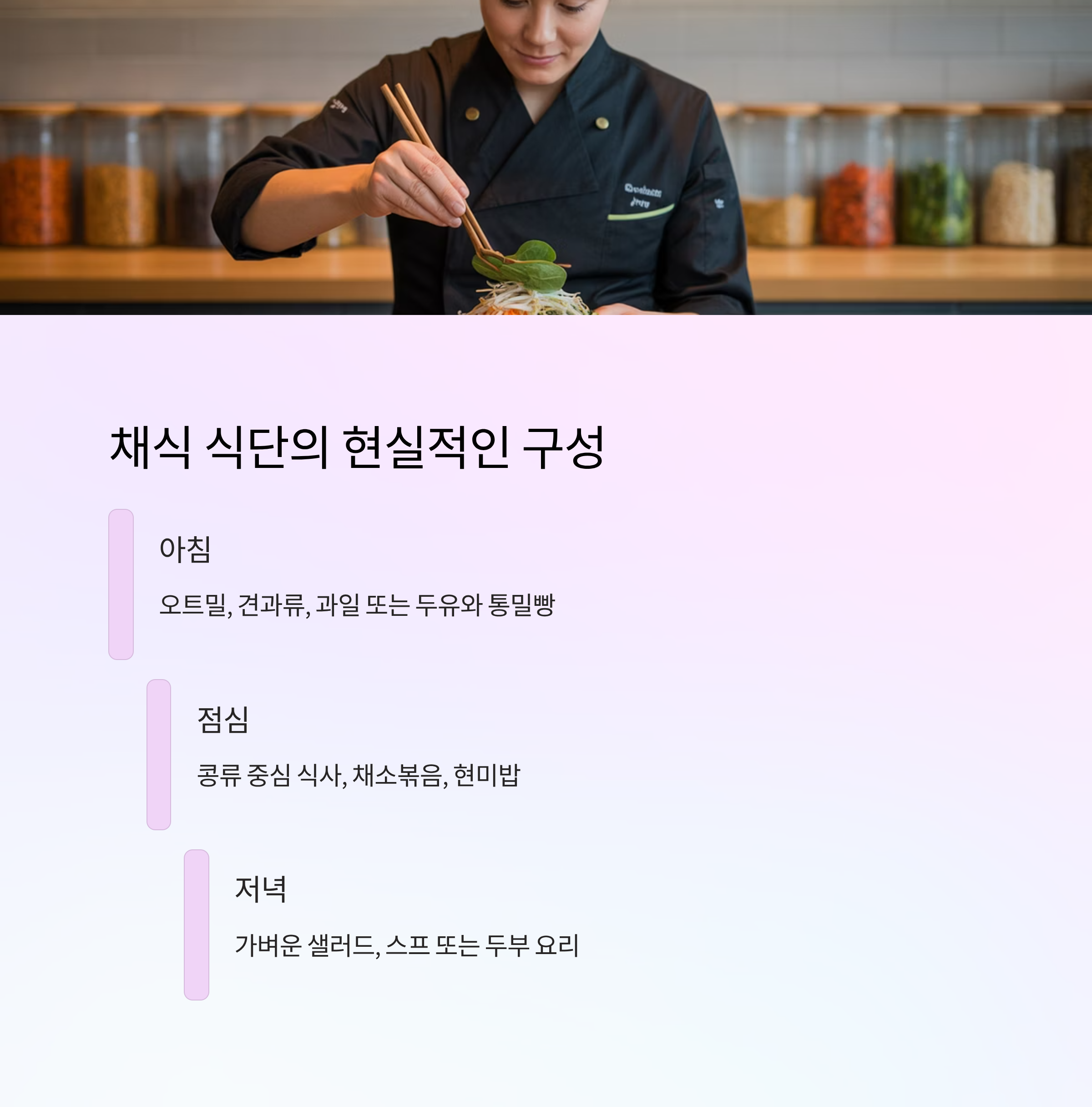 가령 아침엔 식물성 단백질을 중심으로, 점심엔 탄수화물과 채소 중심, 저녁엔 소화가 잘 되는 샐러드나 스프류로 가볍게 구성하는 게 좋아요. 그리고 하루에 한 번은 콩류나 견과류, 통곡물을 포함시키면 좋아요.