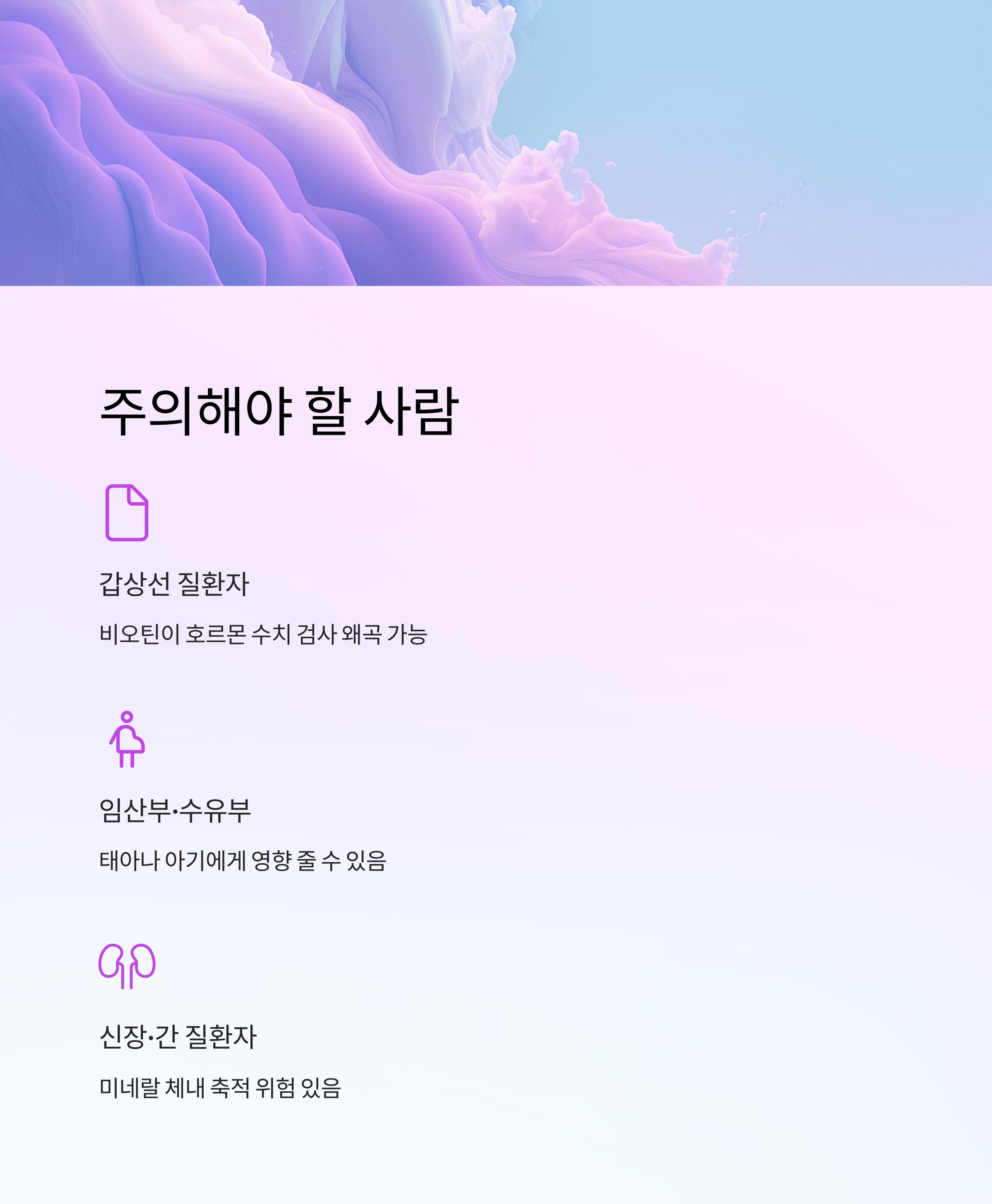 | 갑상선 질환자 | 비오틴 | 호르몬 수치 검사 왜곡 | 검사 전 복용 중단 |