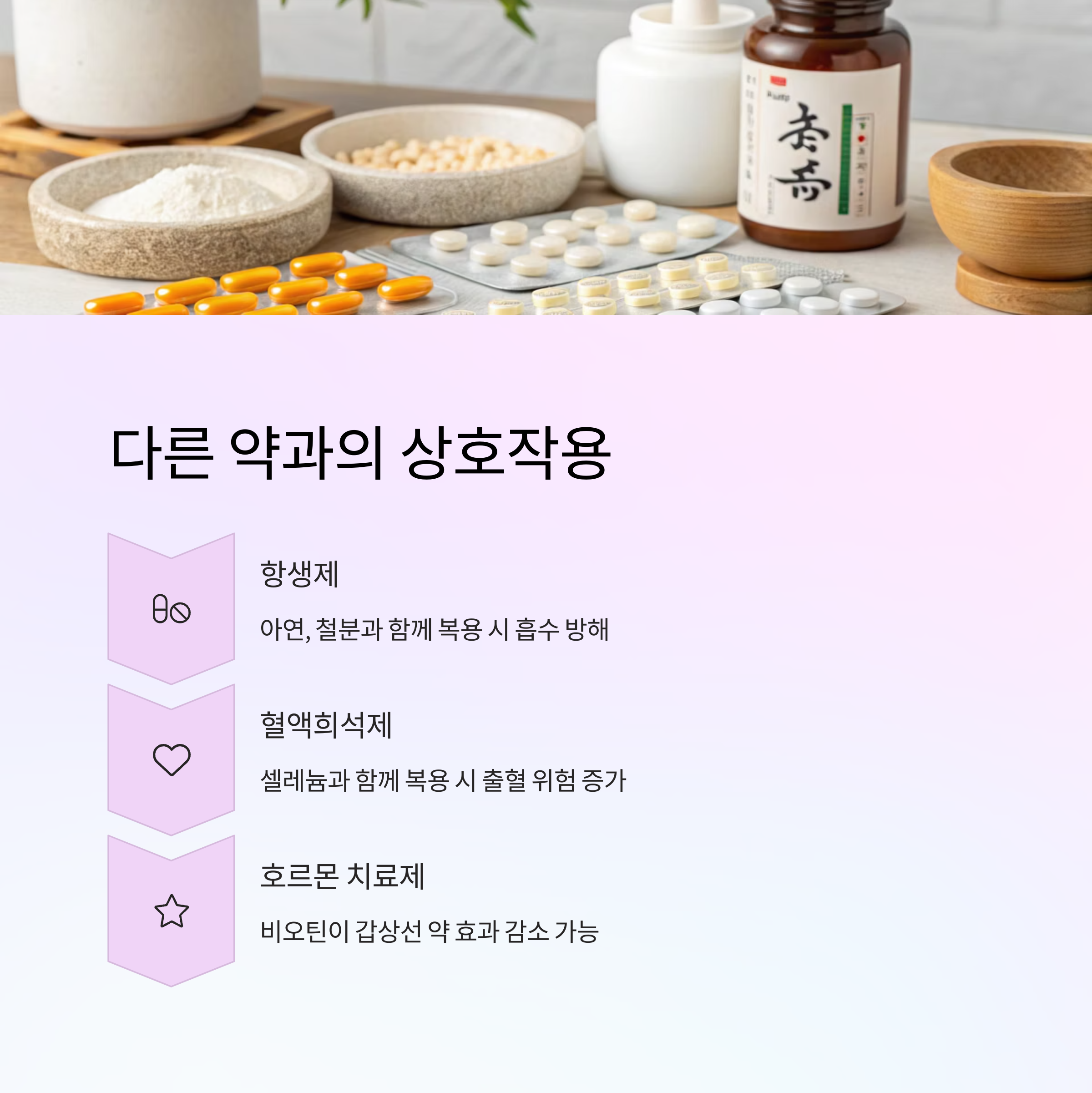 | 비오틴 | 항경련제, 심장약 | 약효 저하 | 복용 간격 조절 |
