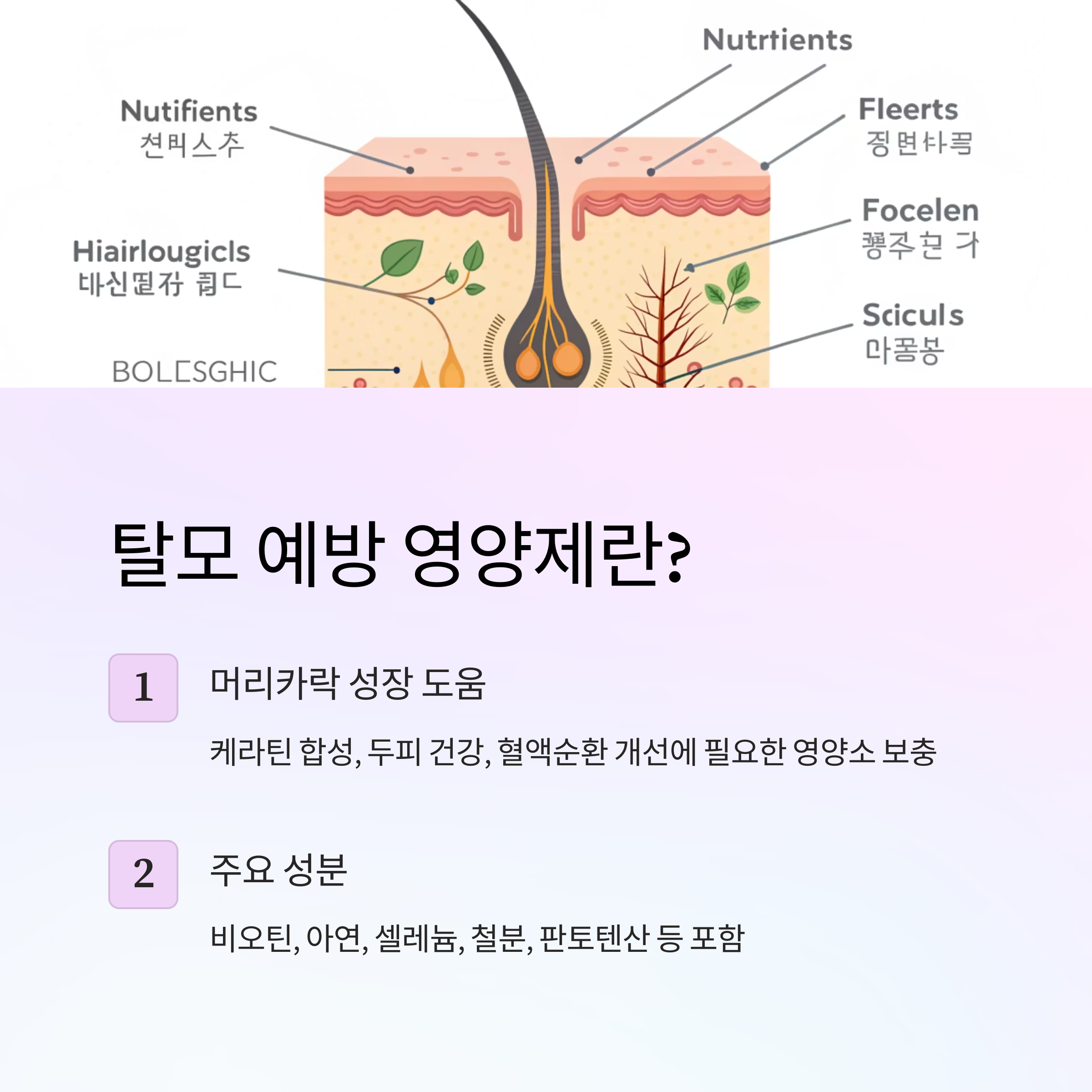 | 비오틴 | 모발 단백질 합성 | 300~5000mcg | 고용량 시 혈액검사 왜곡 |