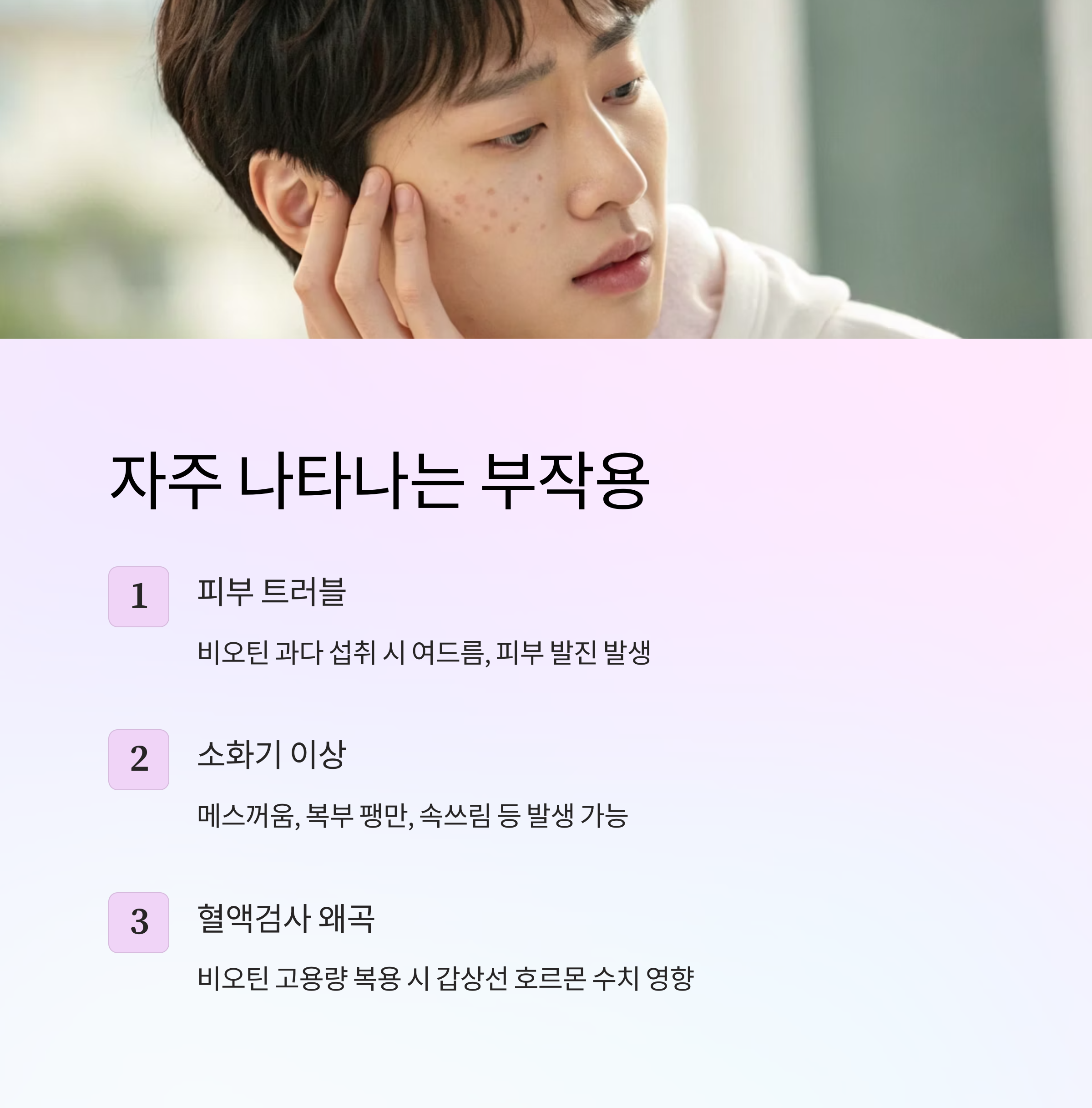 | 여드름 | 비오틴 과다 | 턱이나 이마 부위 트러블 | 권장량 이하 섭취 |