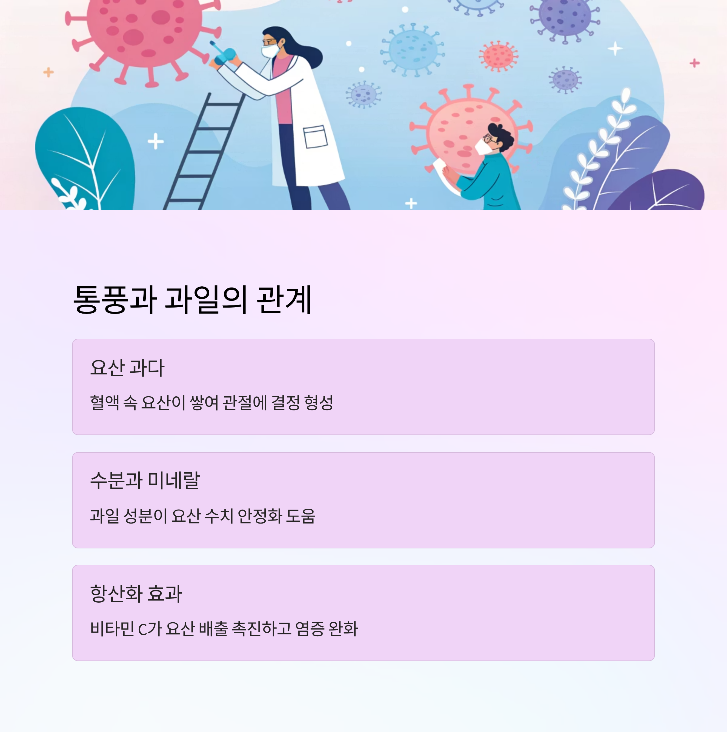 통풍은 혈액 속 요산이 과다하게 쌓이면서 발생해요. 요산은 보통 신장을 통해 소변으로 배출되지만, 배출이 원활하지 않거나 과다 생성되면 체내에 결정으로 남아 관절을 자극해 통증을 만들어요. 이때 과일 속 수분과 미네랄이 균형을 도와 요산 수치를 안정화하는 데 유용하답니다.