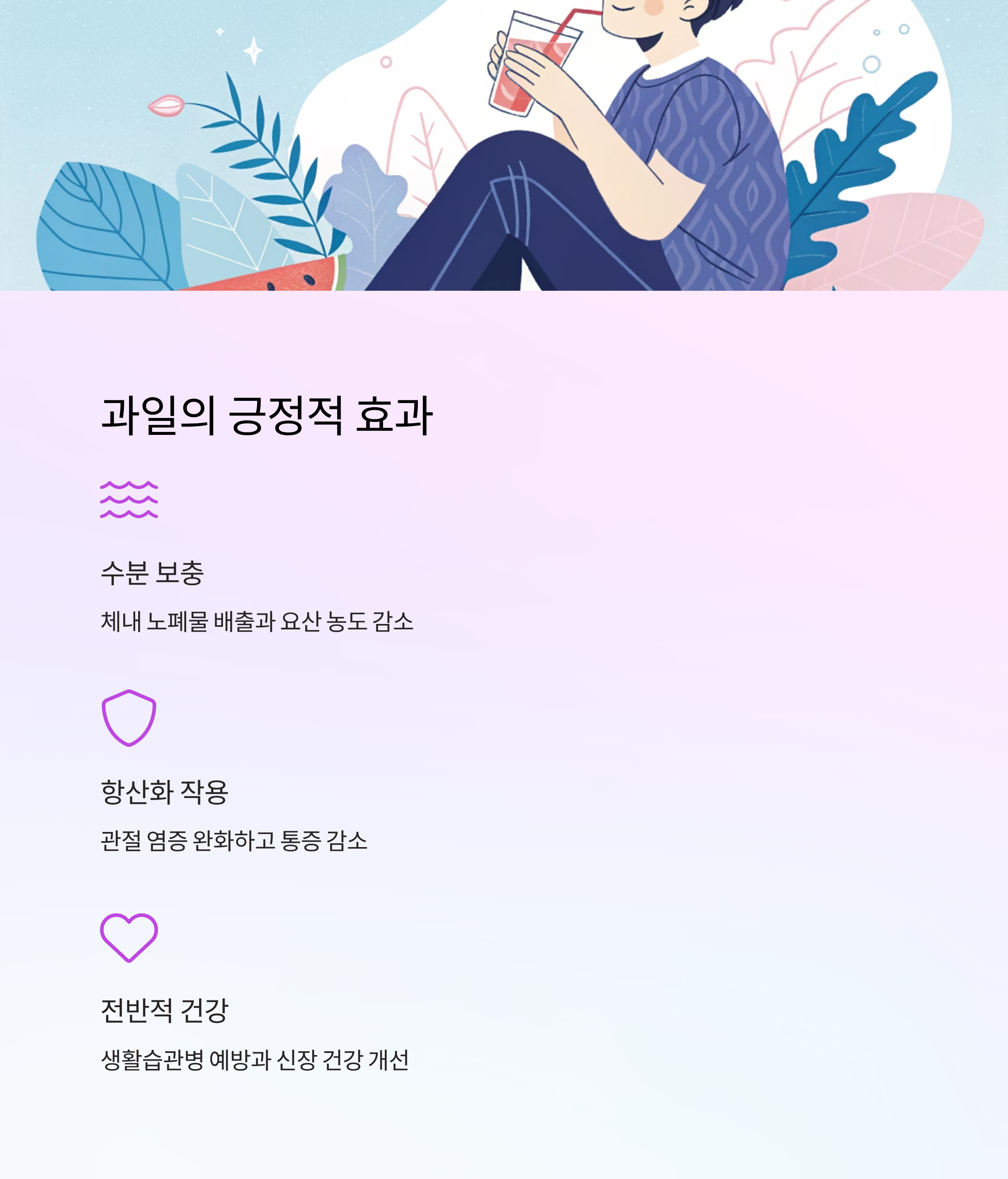 과일 섭취만으로는 충분하지 않아요. 물을 하루 1.5~2리터 이상 마셔 체내 요산을 희석시키는 게 중요해요. 과일은 물과 함께 섭취하면 효과가 배가돼요.
