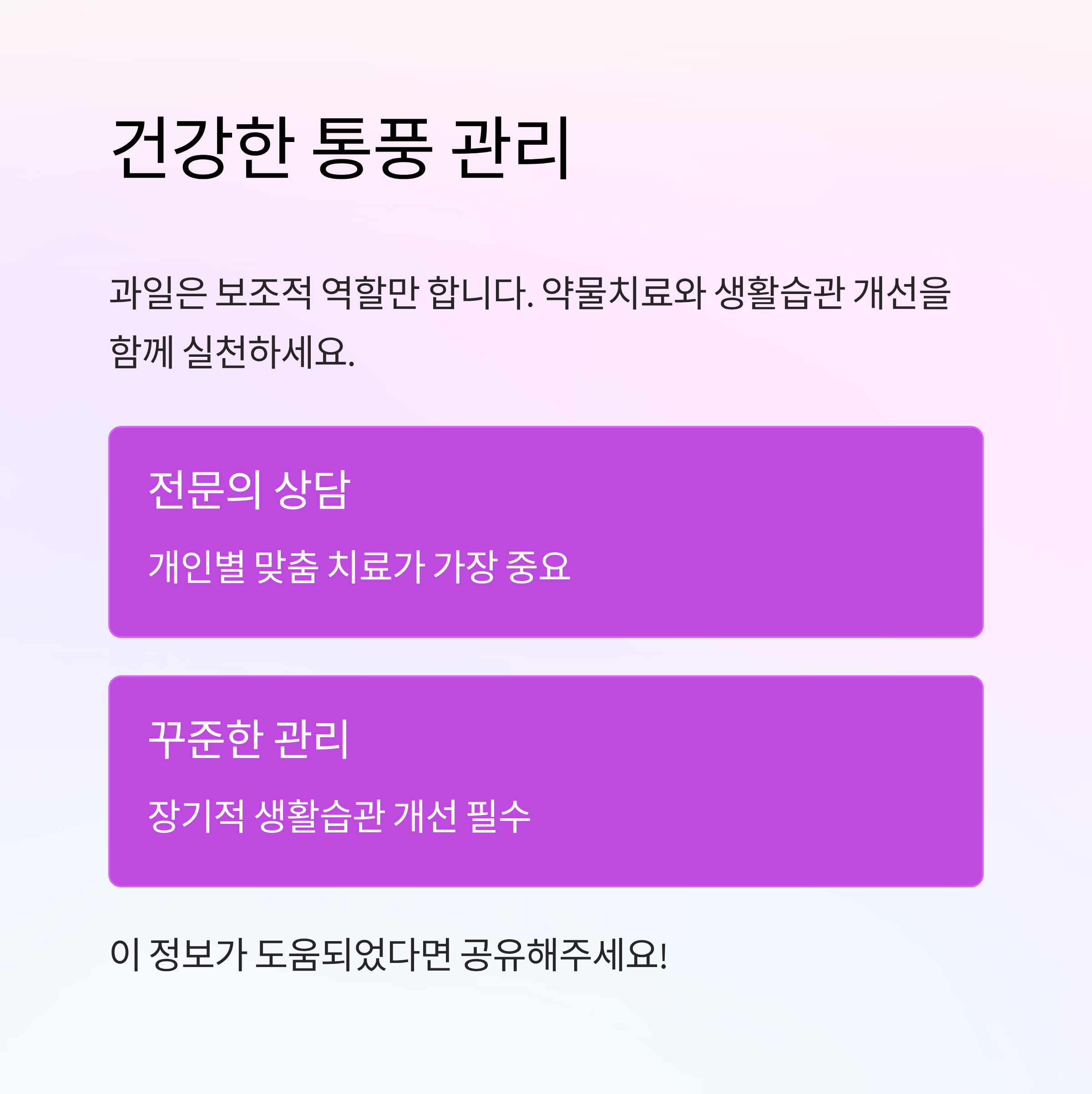 또한 항산화 성분이 관절 내 염증을 완화하고 통증을 줄여주는 효과가 있어요. 꾸준히 과일을 먹는 습관은 통풍뿐 아니라 전반적인 생활습관병 예방에도 연결돼요.