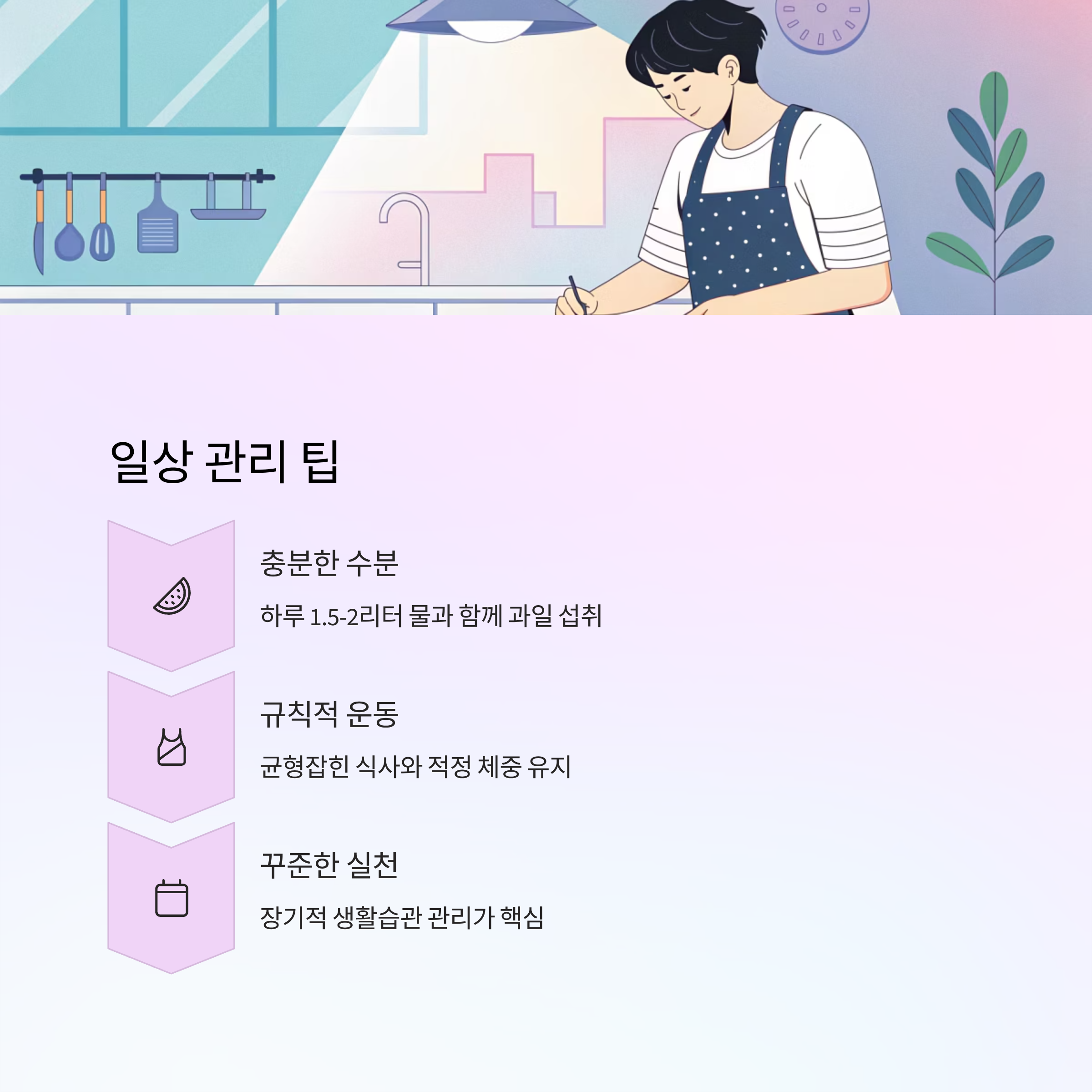 또한 규칙적인 운동과 균형 잡힌 식사, 적정 체중 유지도 필수예요. 과일을 활용한 샐러드나 스무디를 건강 간식으로 선택하면 좋아요.