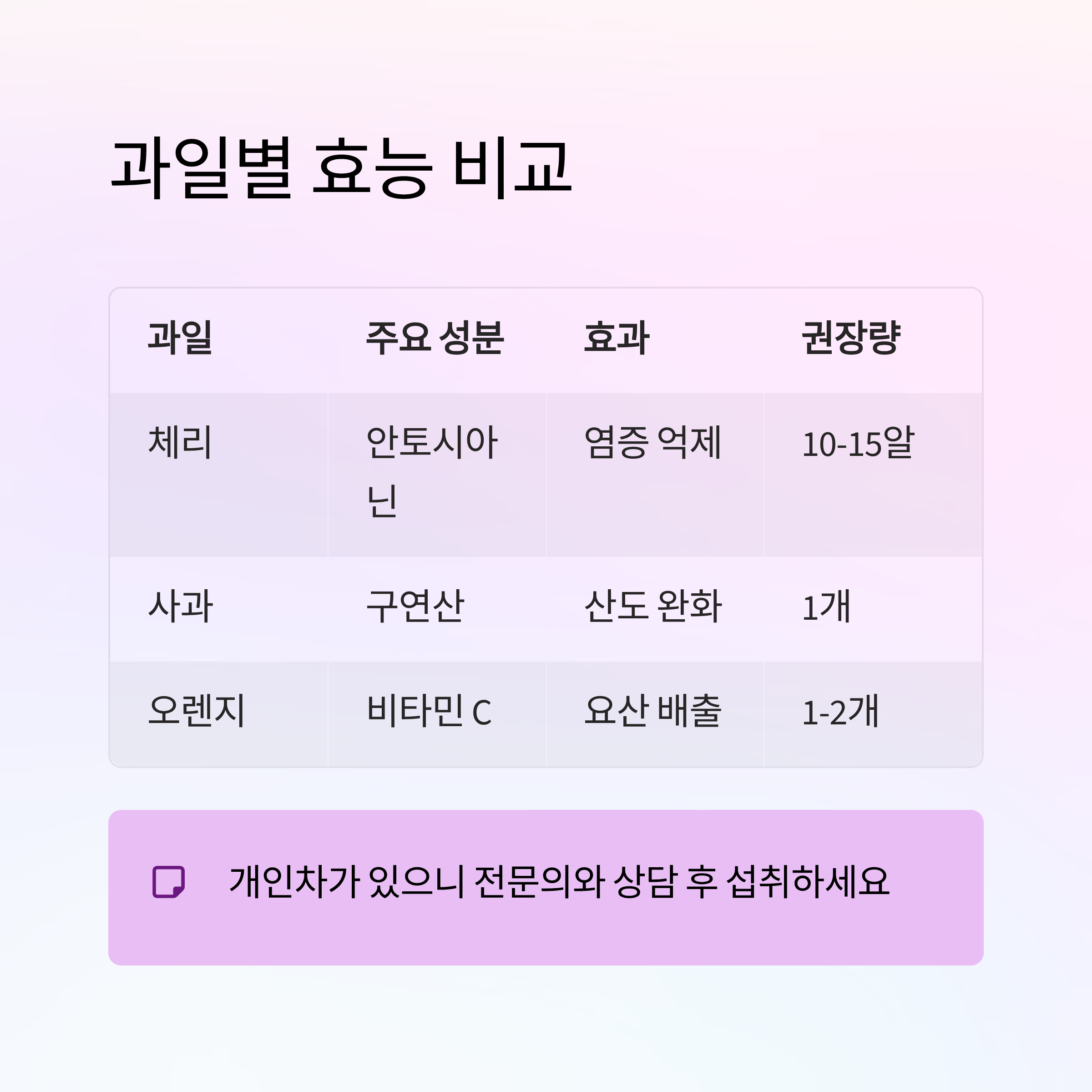 | 체리 | 안토시아닌 | 염증 억제, 요산 낮춤 | 하루 10~15알 |
