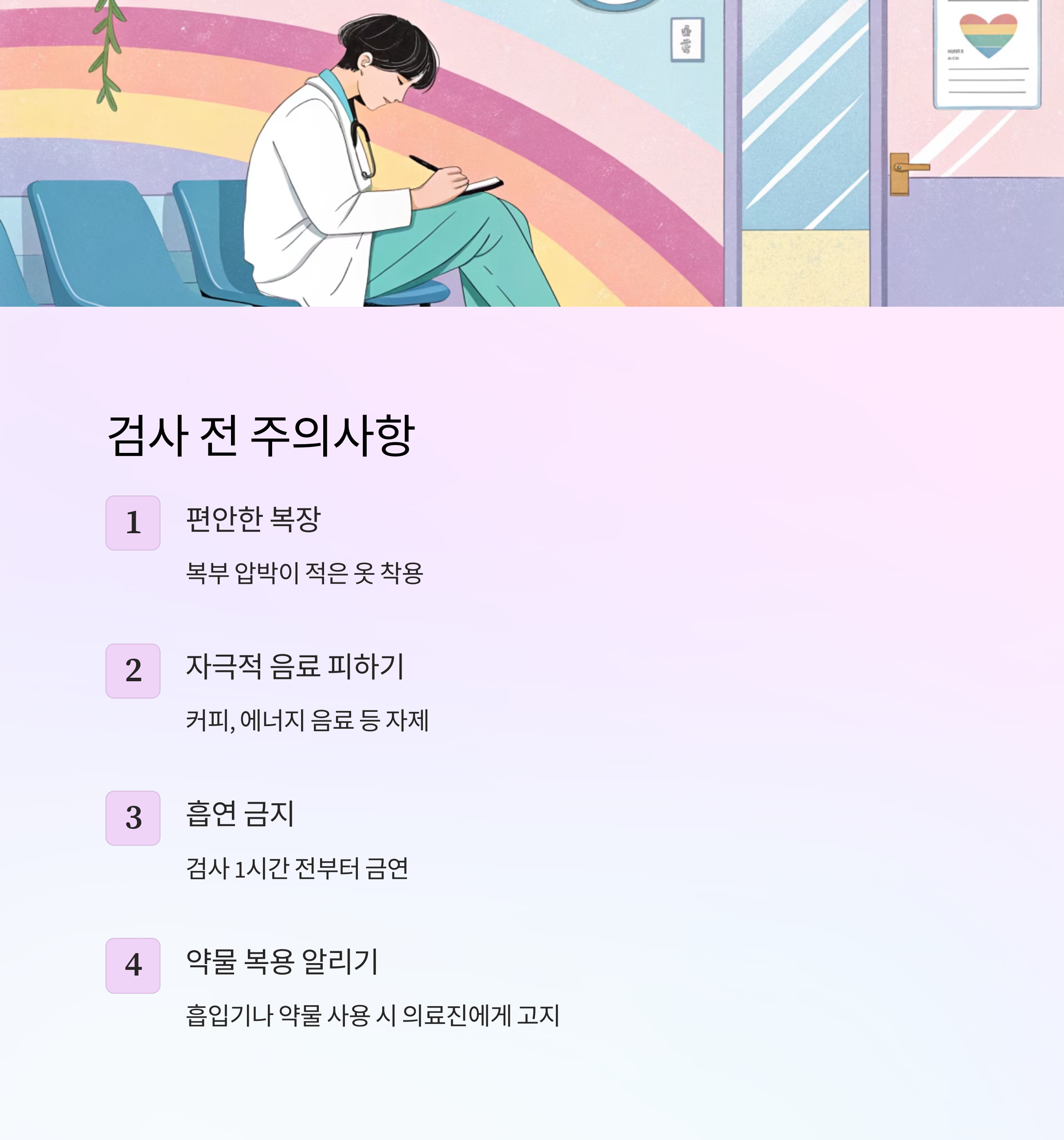 A6. 편안한 복장을 착용하고, 커피나 에너지 음료 등 자극적인 음료는 피하는 것이 좋아요. 흡입기나 약물을 사용하는 경우 의료진에게 꼭 알려야 해요.