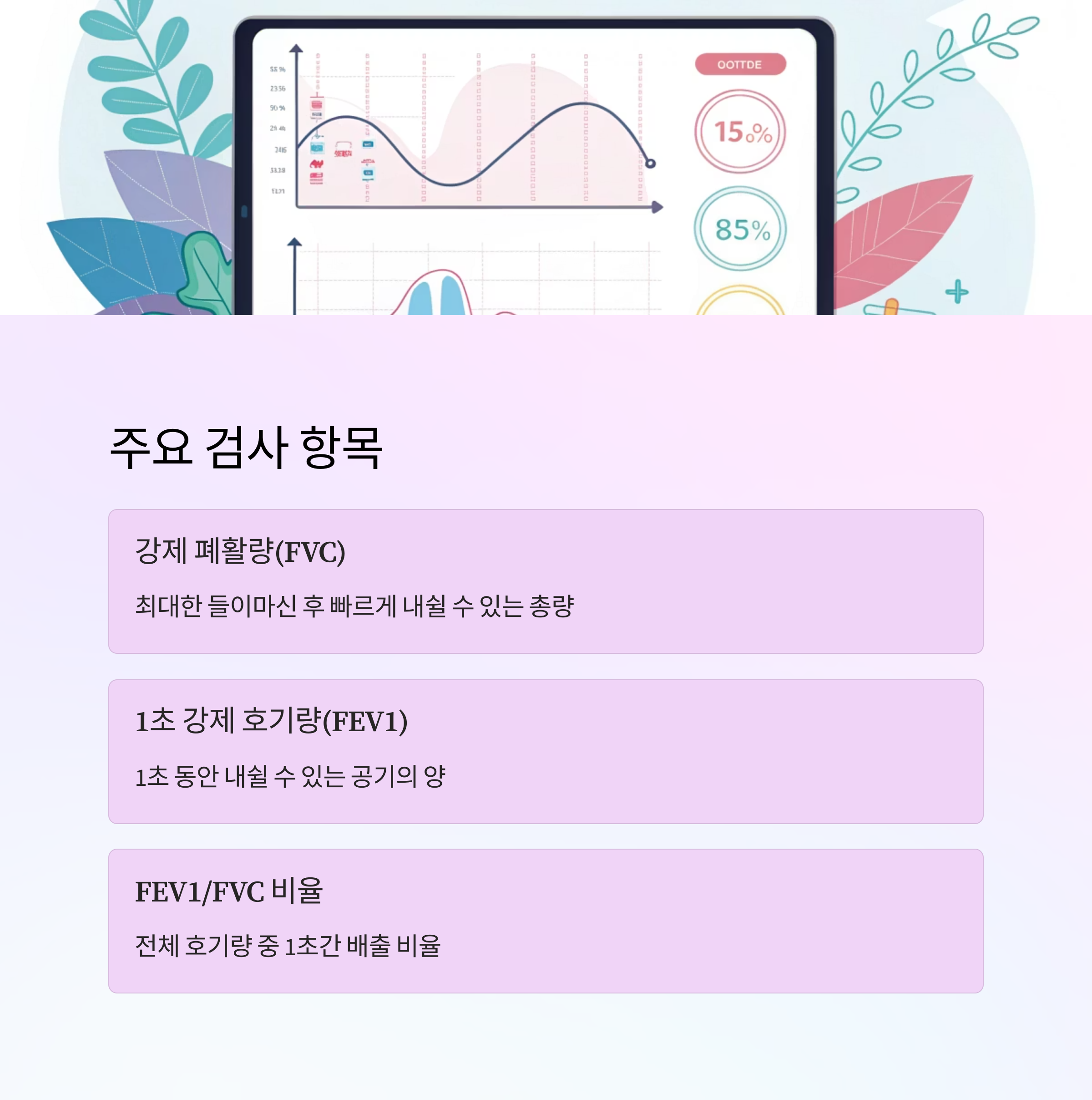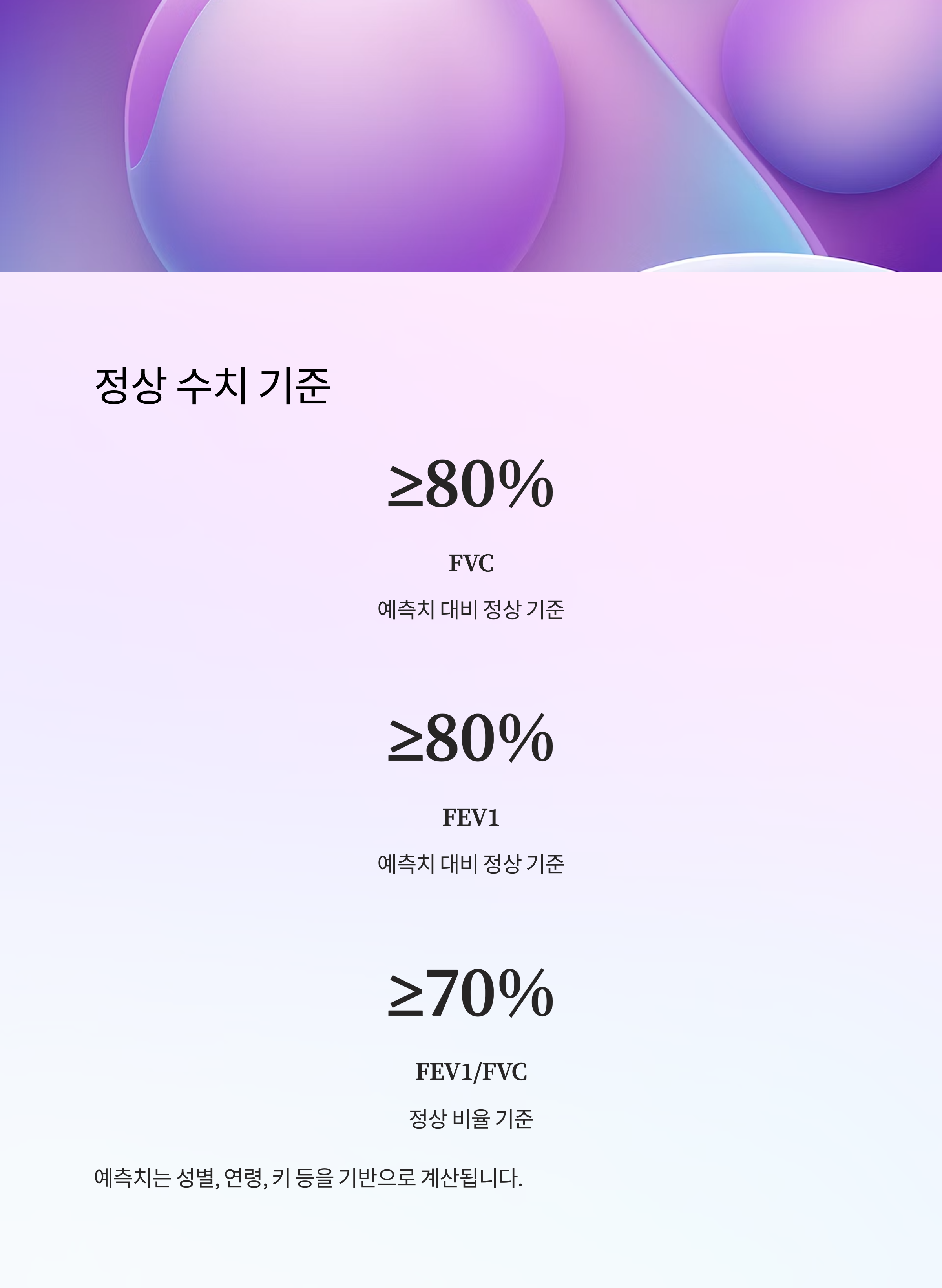 📌 요약하자면, 예측치의 80% 이상이면 대부분 정상으로 간주해요. 다만, 비율 수치(FEV1/FVC)는 질환 구분에 핵심 역할을 한답니다!