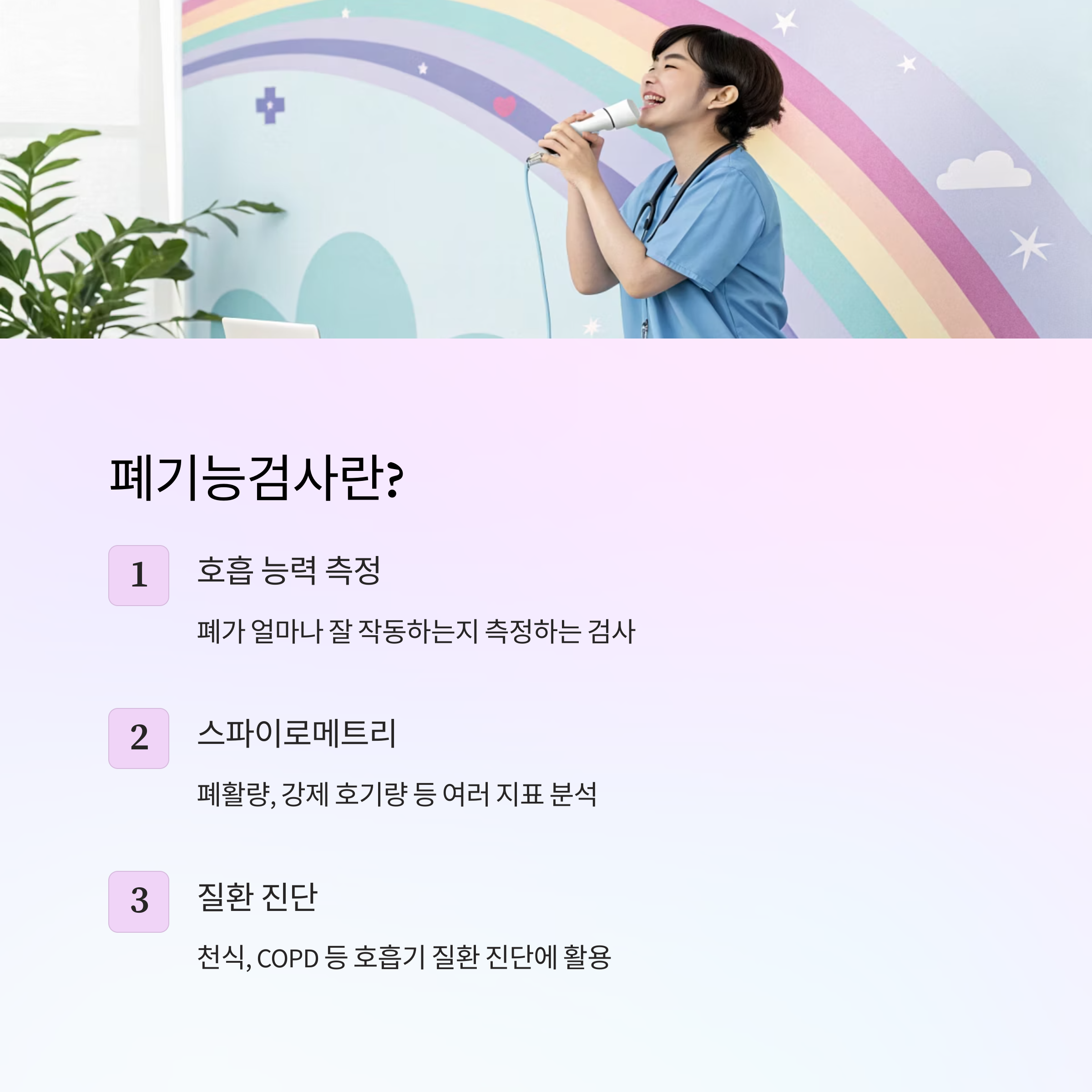 이 검사는 천식, 만성 폐쇄성 폐질환(COPD), 폐 섬유증, 기관지 확장증 등 다양한 호흡기 질환을 진단하거나 질병의 경과를 모니터링할 때 사용돼요.