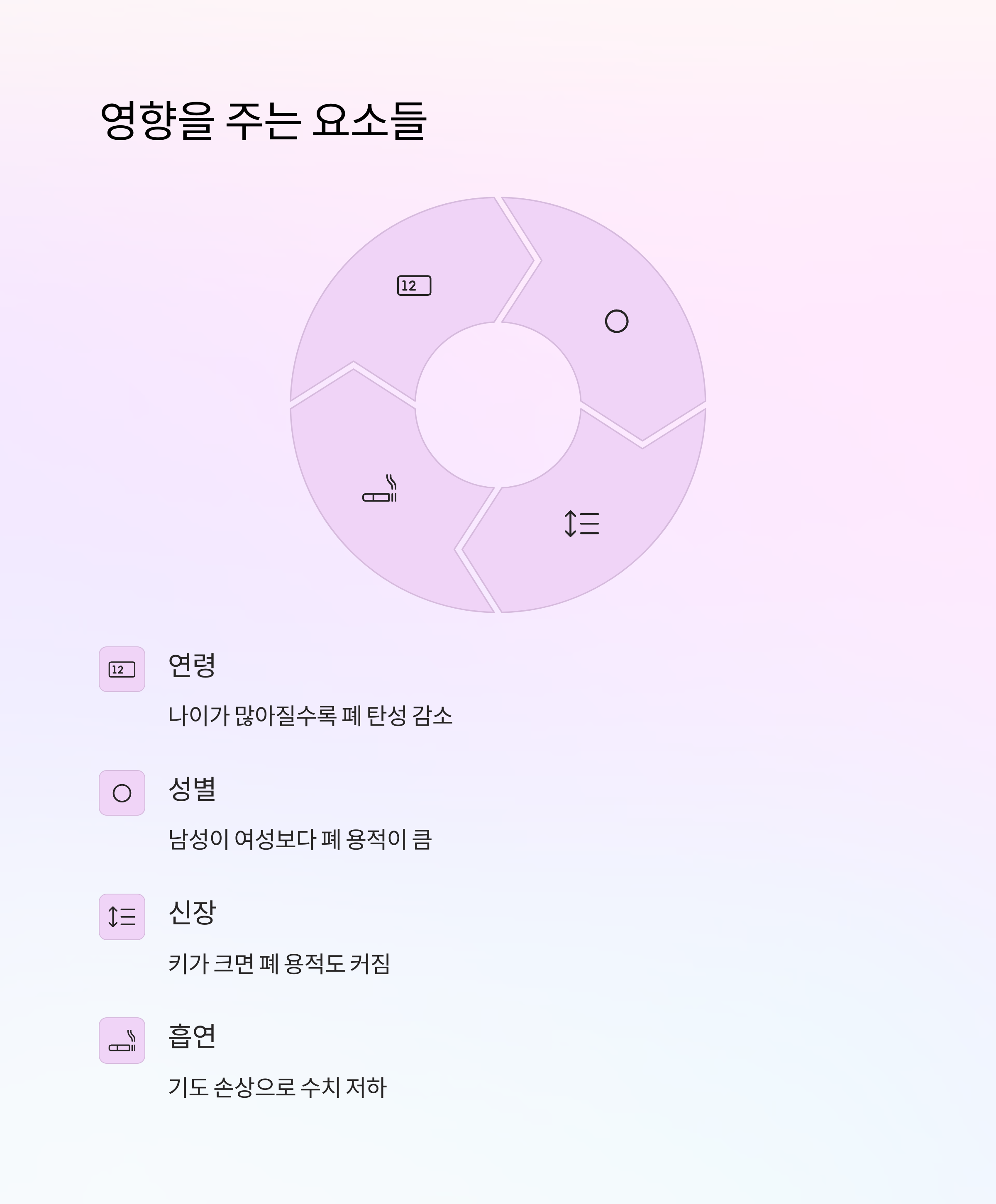 첫 번째로 영향을 주는 요소는 '연령'이에요. 나이가 많아질수록 폐의 탄성이 줄어들기 때문에, 자연스럽게 FVC나 FEV1 수치도 감소해요. 그래서 노인의 경우 70% 수준이더라도 정상으로 보는 경우도 있어요.