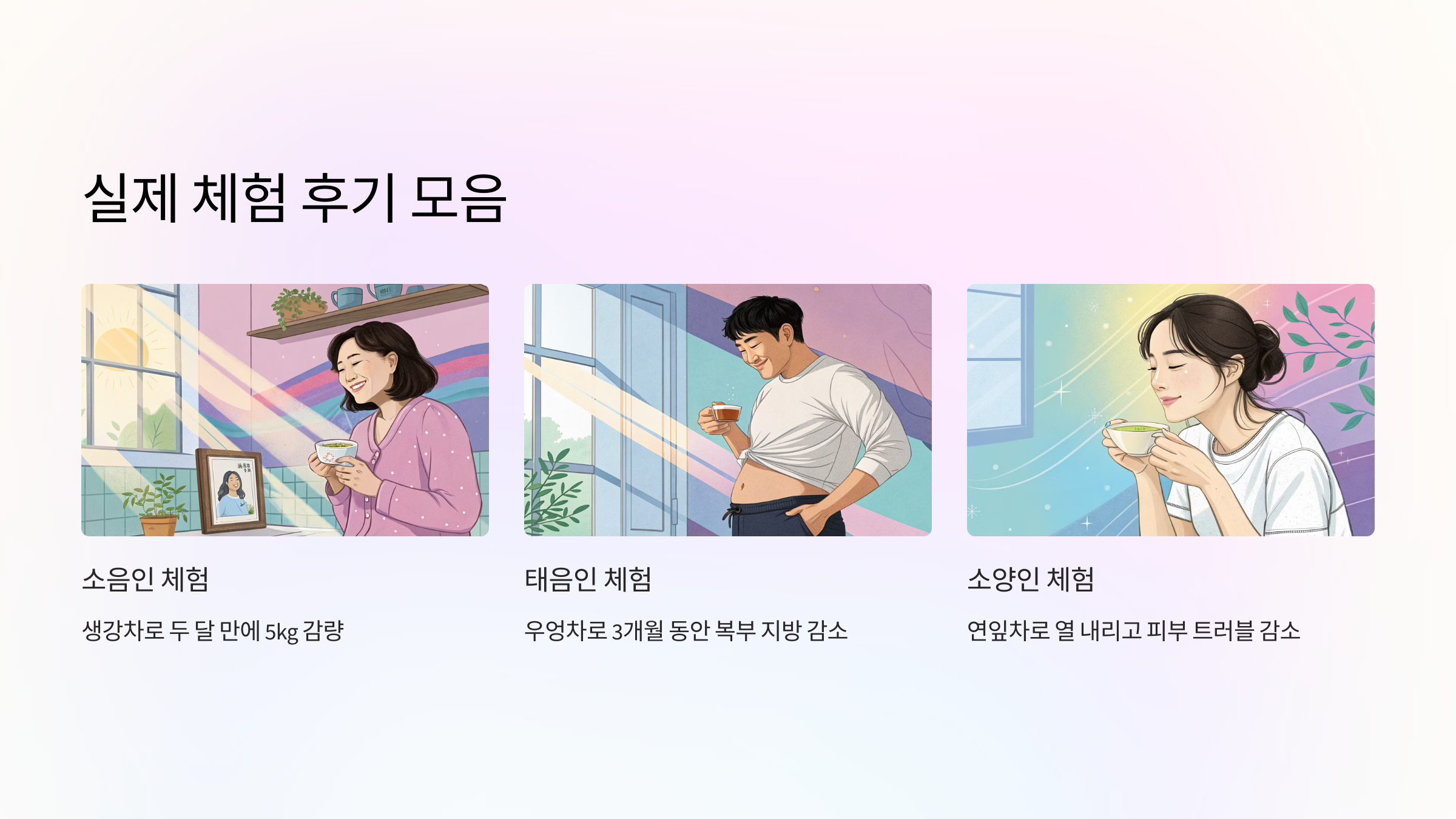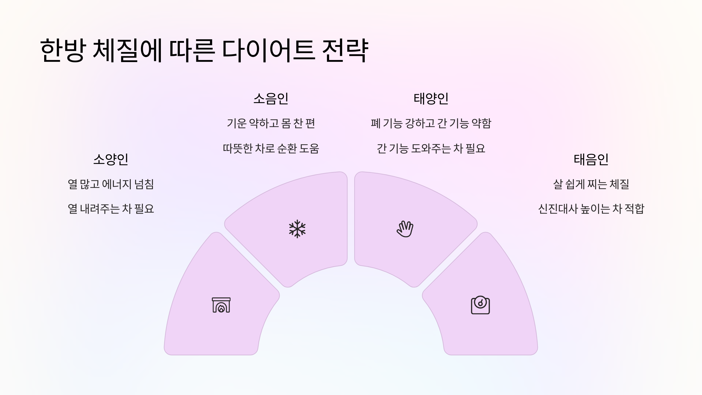 - 소양인: 열이 많고 에너지가 넘쳐요. 다이어트할 때는 몸속 열을 내려주는 차가 필요해요.