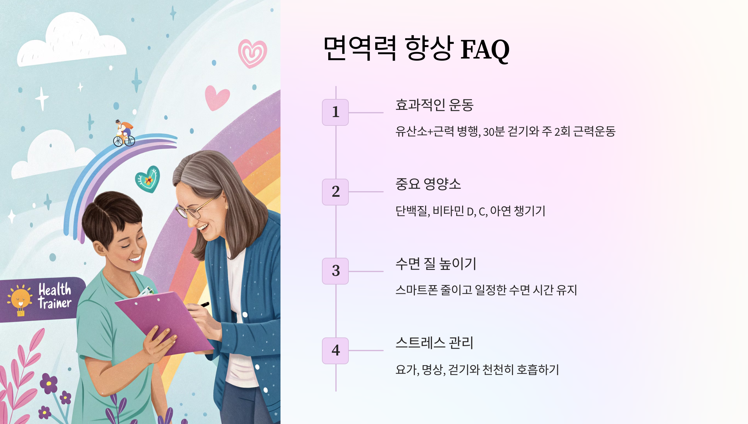 A6. 면역력을 끌어올리기 위한 생활습관 개선이 우선이에요. 특히 수면, 운동, 스트레스 관리가 중요해요.