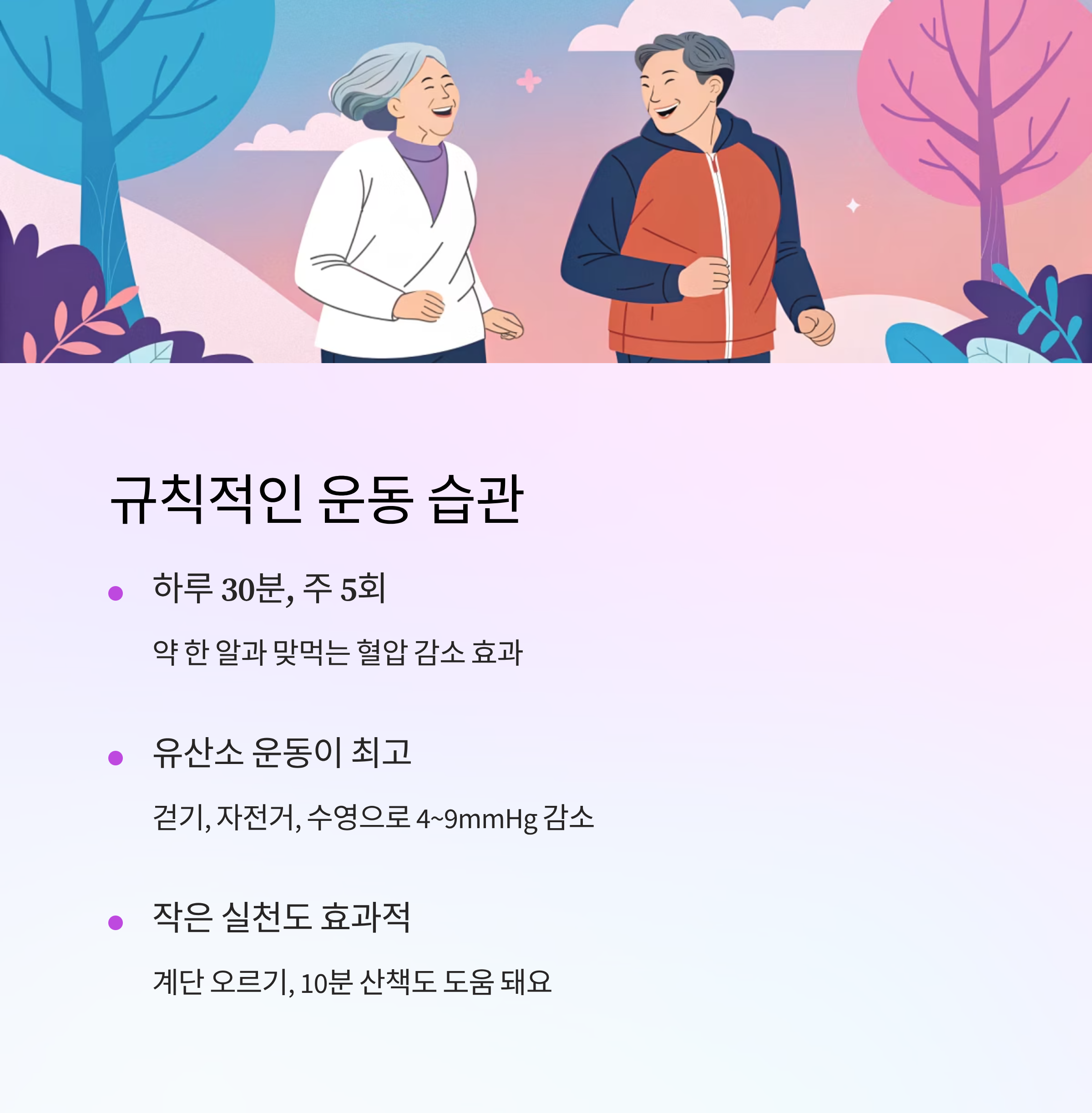 운동은 단순히 혈압만 낮추는 게 아니라 스트레스 해소, 체중 조절, 심폐기능 개선에도 효과적이에요. 특히 아침 햇살을 받으며 산책하면 세로토닌 분비가 활발해져 기분까지 좋아지니, 일석이조의 효과를 누릴 수 있답니다. ☀️