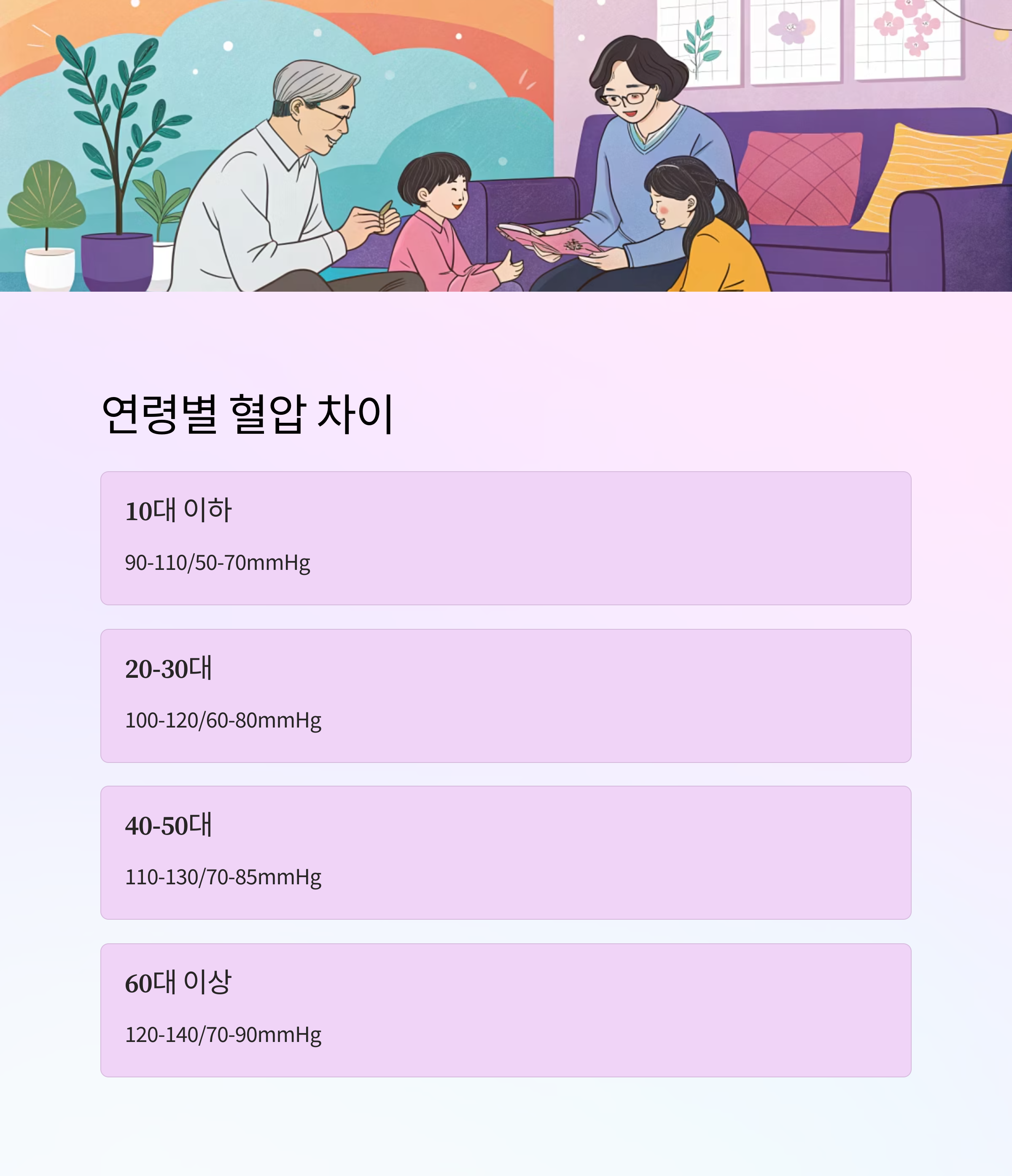 | 연령대 | 정상 수축기(mmHg) | 정상 이완기(mmHg) |
