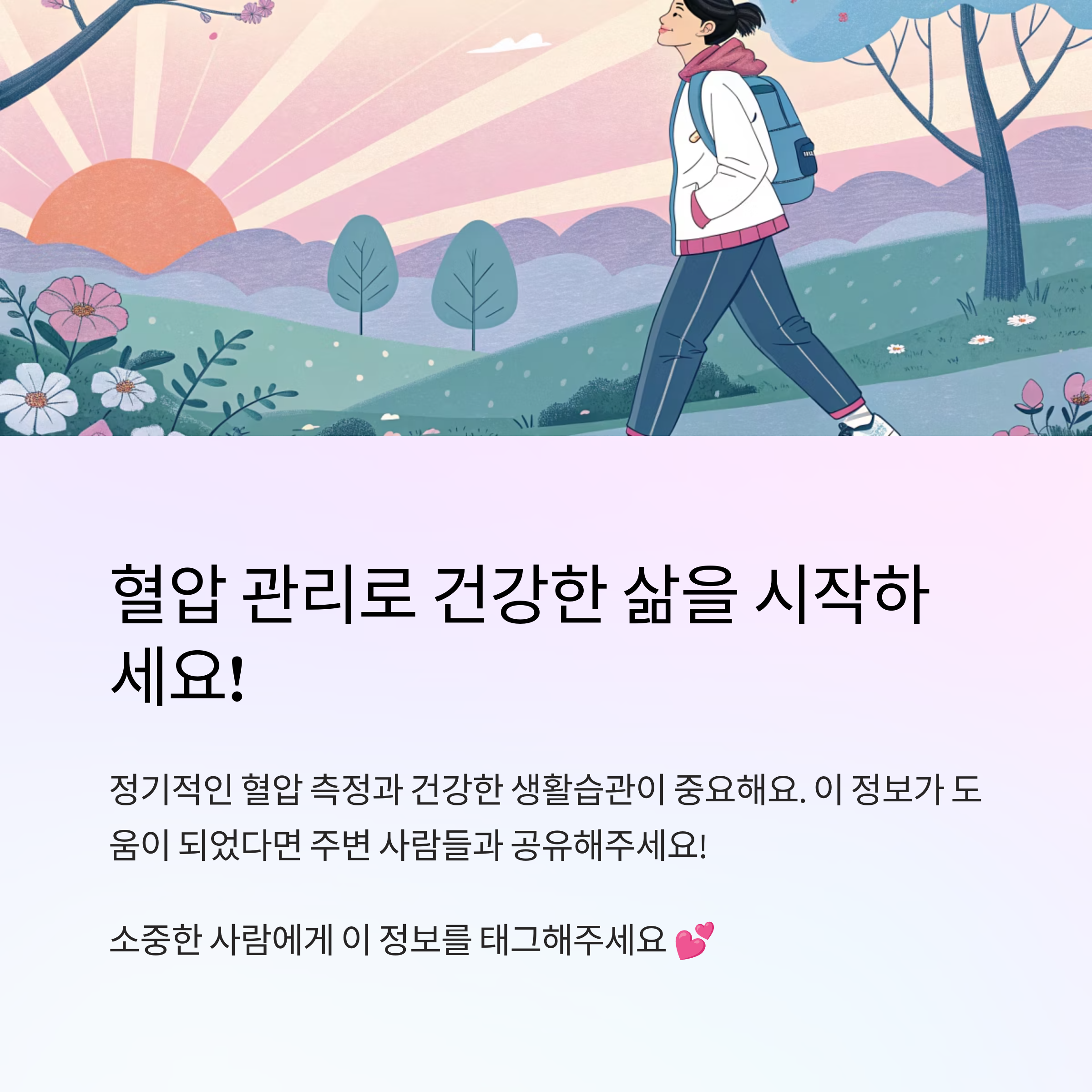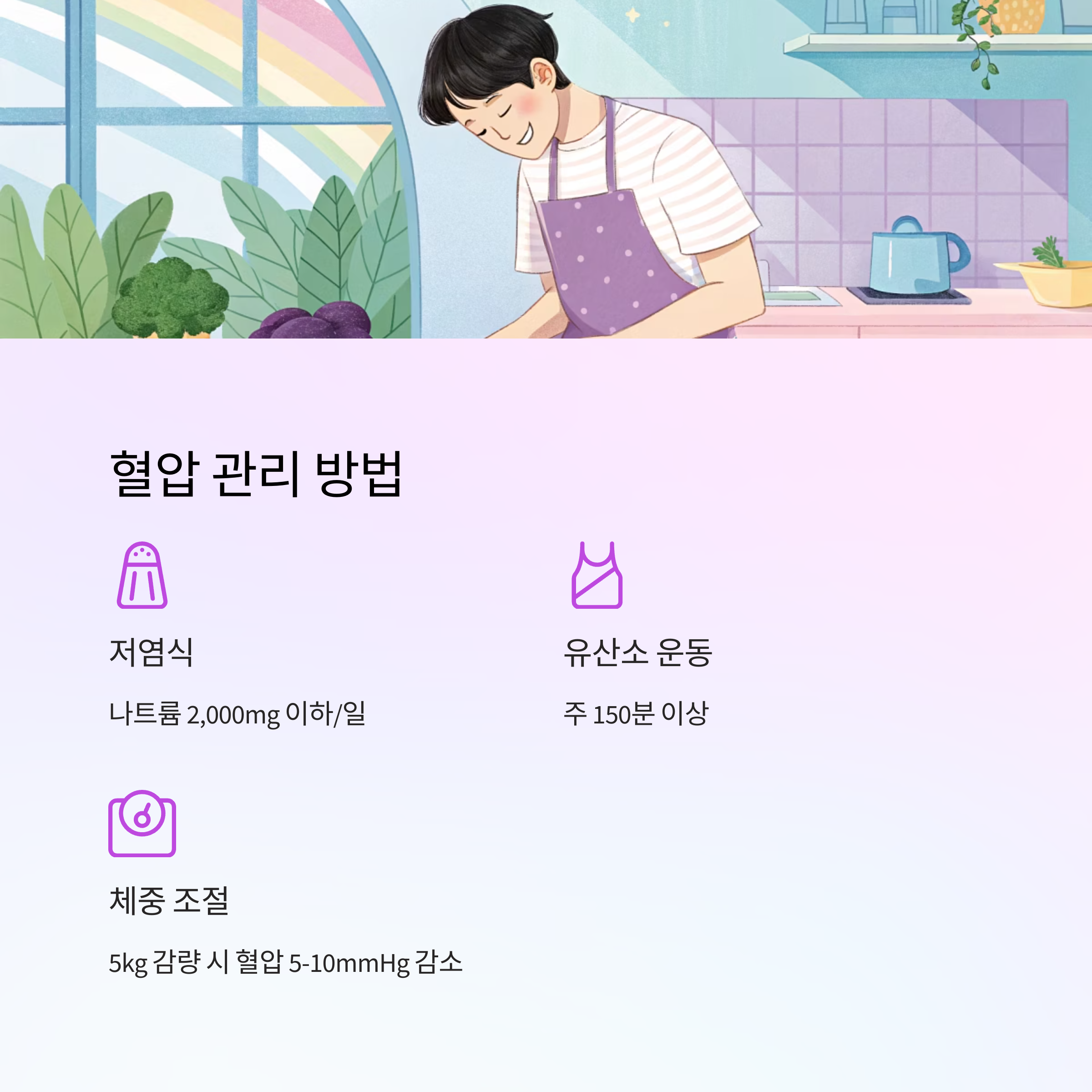 작은 변화들이 모여 큰 차이를 만들어요. 하루 한 끼라도 저염식으로 바꾸고, 엘리베이터 대신 계단을 이용하는 습관부터 시작해보면 어때요? 😊