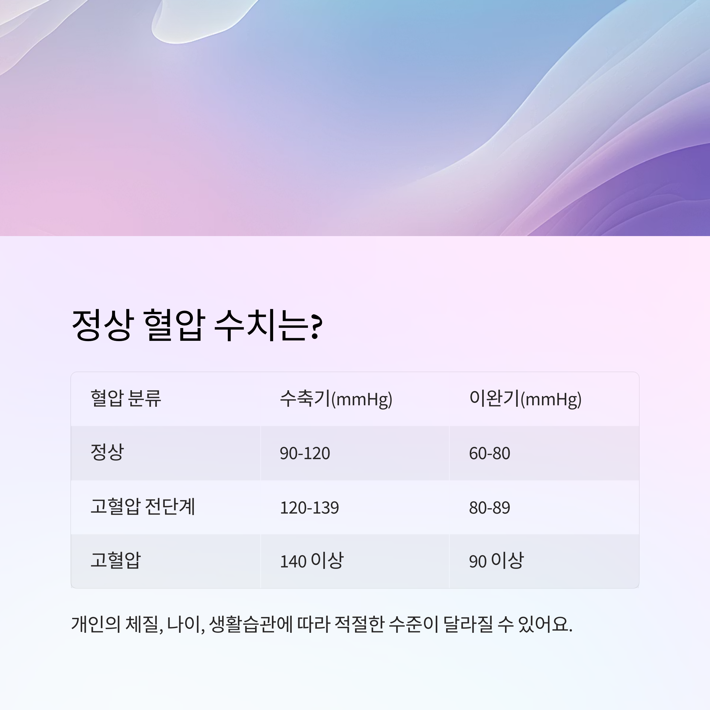 혈압은 개인마다 체질, 건강상태, 나이, 생활습관 등에 따라 적절한 수준이 달라질 수 있어요. 예를 들어 운동선수는 심장이 강하기 때문에 일반인보다 낮은 수치를 보여도 건강하답니다.