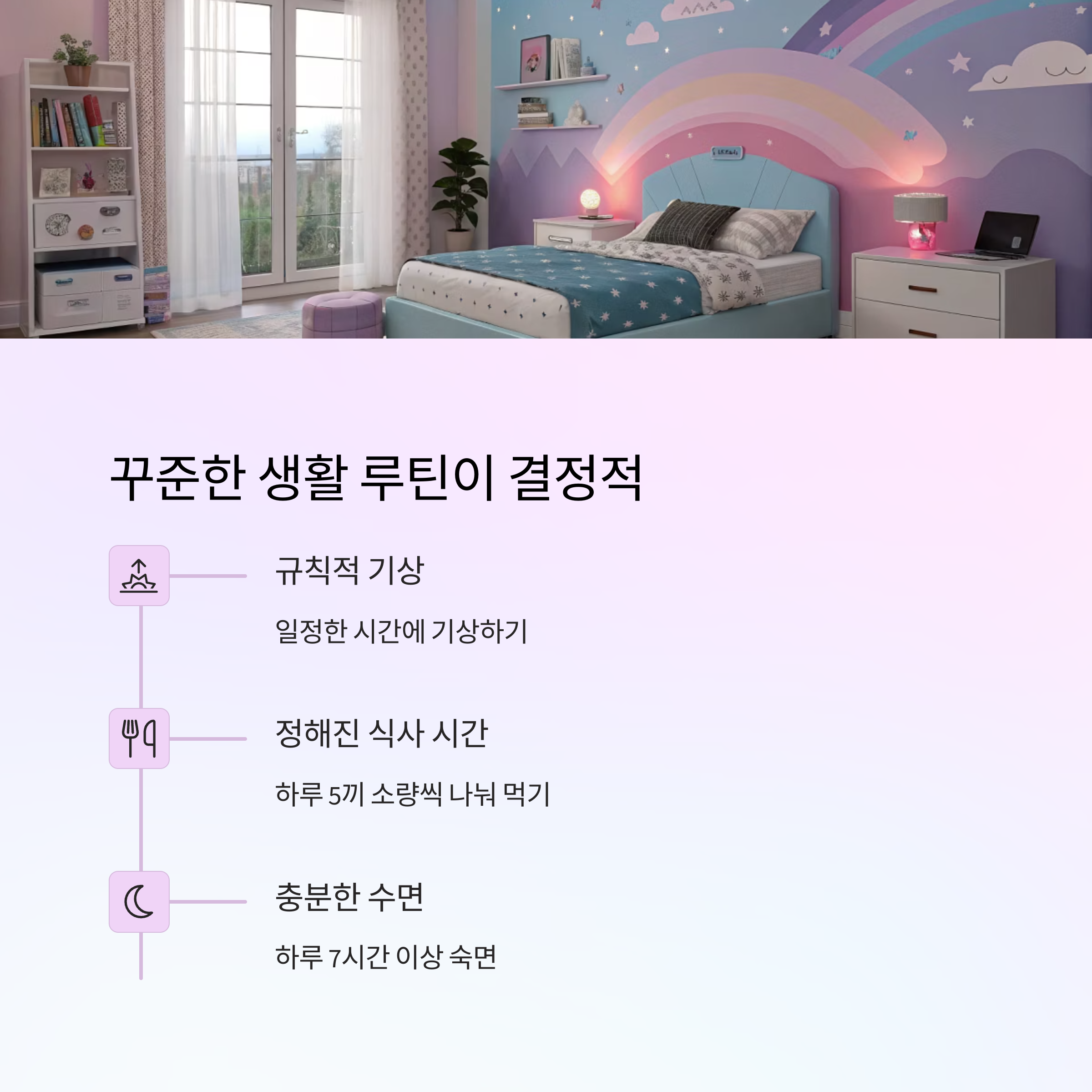가끔은 좋아하는 음악 듣기, 친구와 수다 떨기, 취미활동하기 같은 심리적 보상이 필요한 순간도 있어요. 정신 건강이 곧 신체 건강으로 연결되는 시기이기 때문에 마음도 가볍게 챙겨줘야 해요.🌈