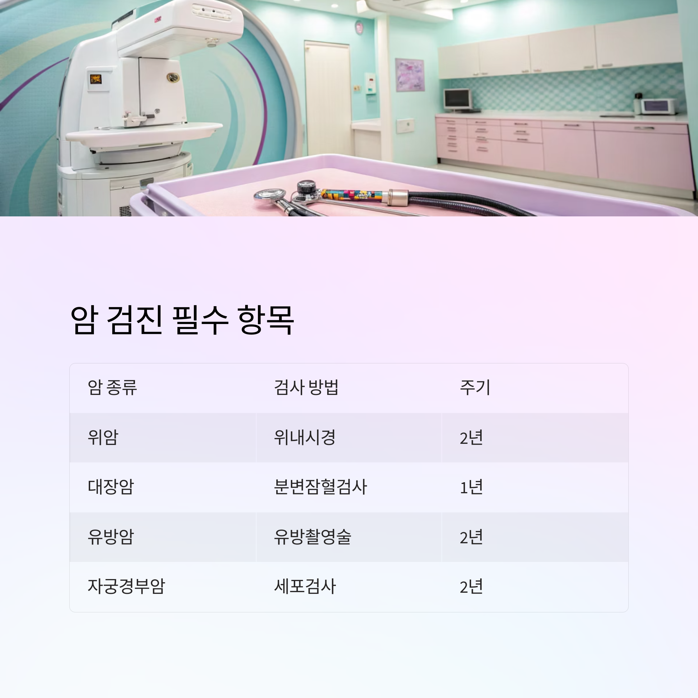 | 간암 | 초음파 + 혈액검사(AFP) | 6개월 | B형/C형 간염 보균자 |