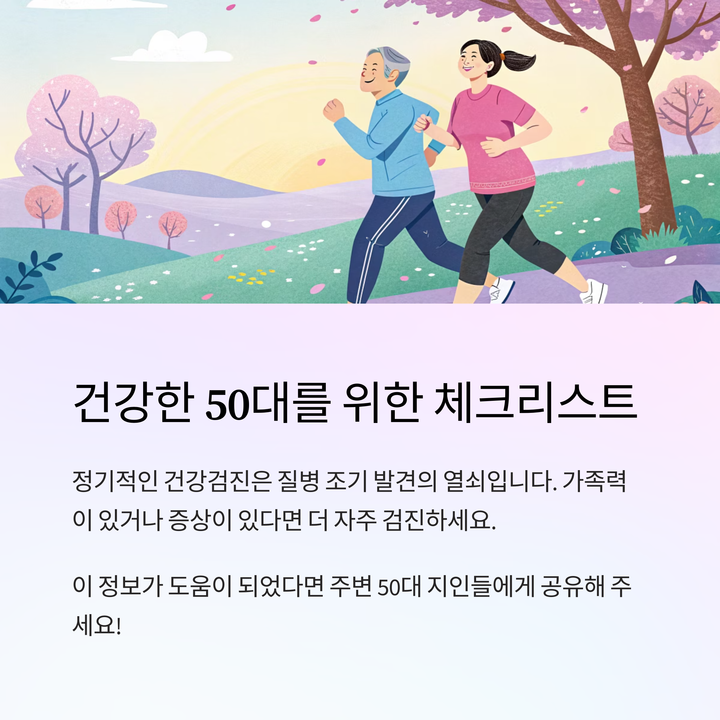 50대는 건강 관리의 전환점이 되는 시기예요. 신체 노화가 본격적으로 시작되고, 만성질환과 암 발생 위험도 높아지기 때문에 조기 발견과 예방이 무엇보다 중요하답니다. 국가에서 제공하는 일반 건강검진 외에도 개인의 건강 상태에 따라 추가적인 항목을 점검하는 것이 필요해요.
