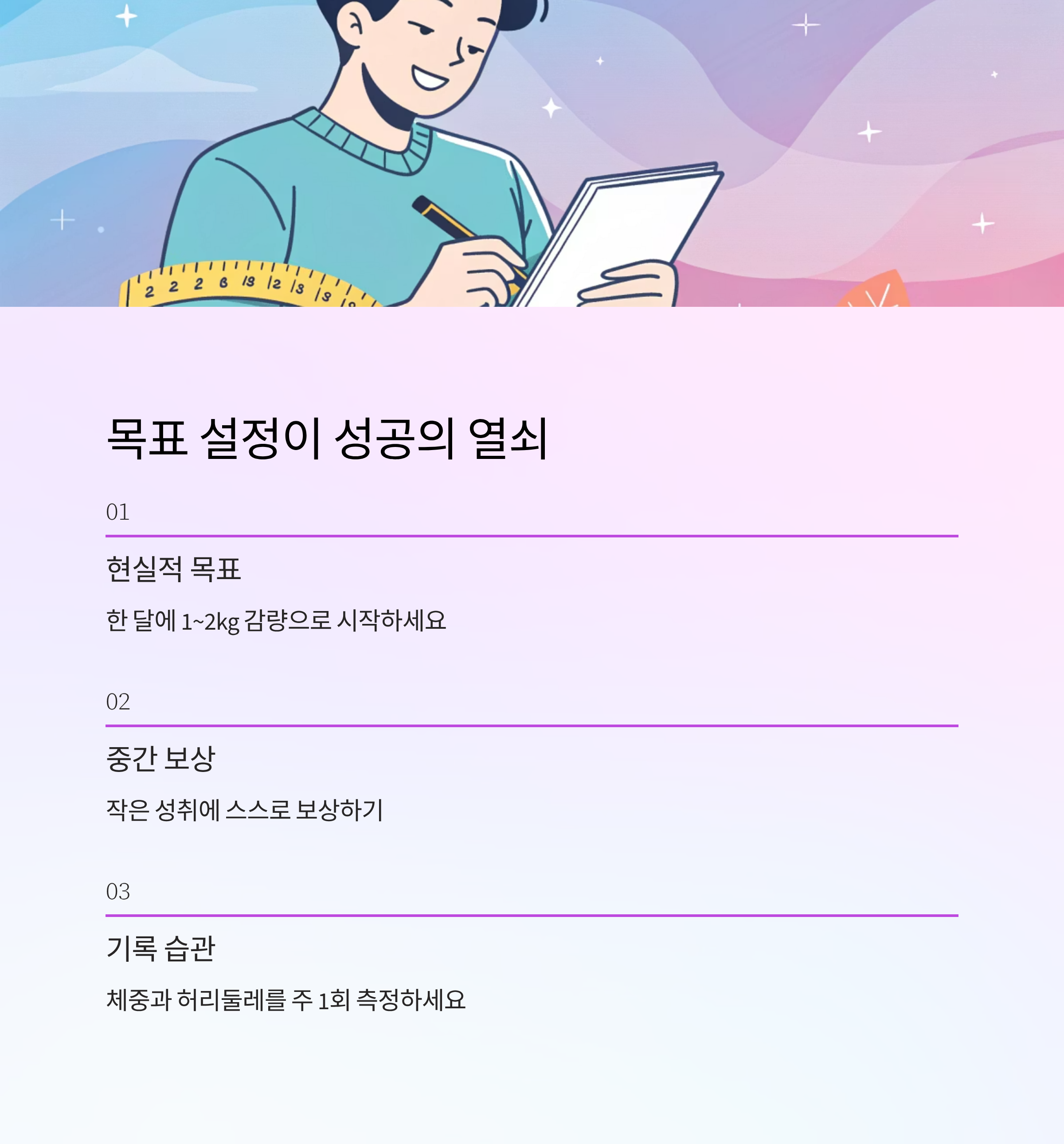 먼저 현실적인 목표를 세우는 게 중요해요. 예를 들어 ‘한 달에 1~2kg 감량’처럼 무리하지 않는 범위에서 설정해야 합니다. 단기간에 많이 빼려고 하면 근육 손실이 커지고, 요요가 오기 쉽습니다.