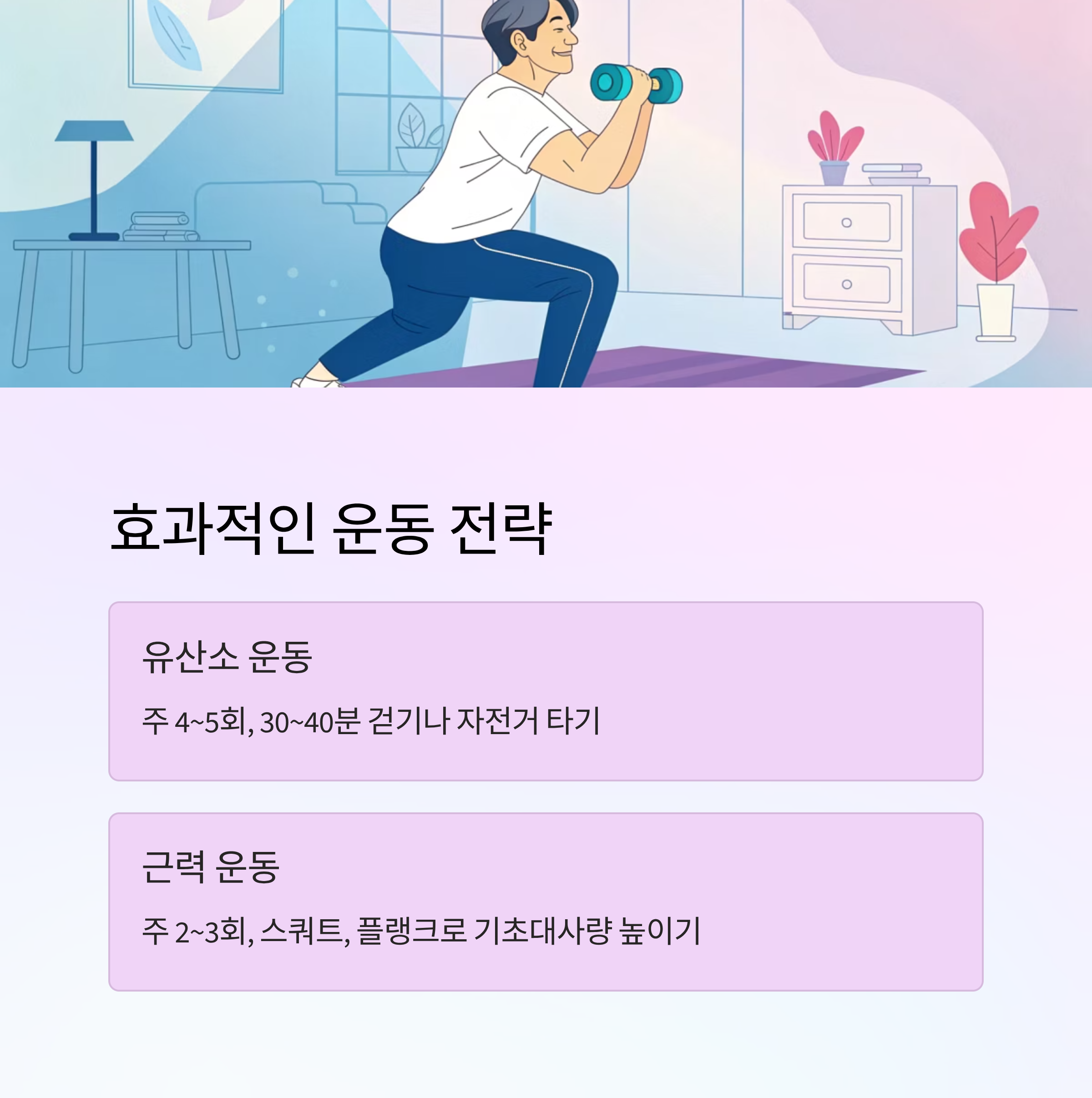 | 빠르게 걷기 | 30분, 주 5회 | 지방 연소, 심폐 건강 개선 |
